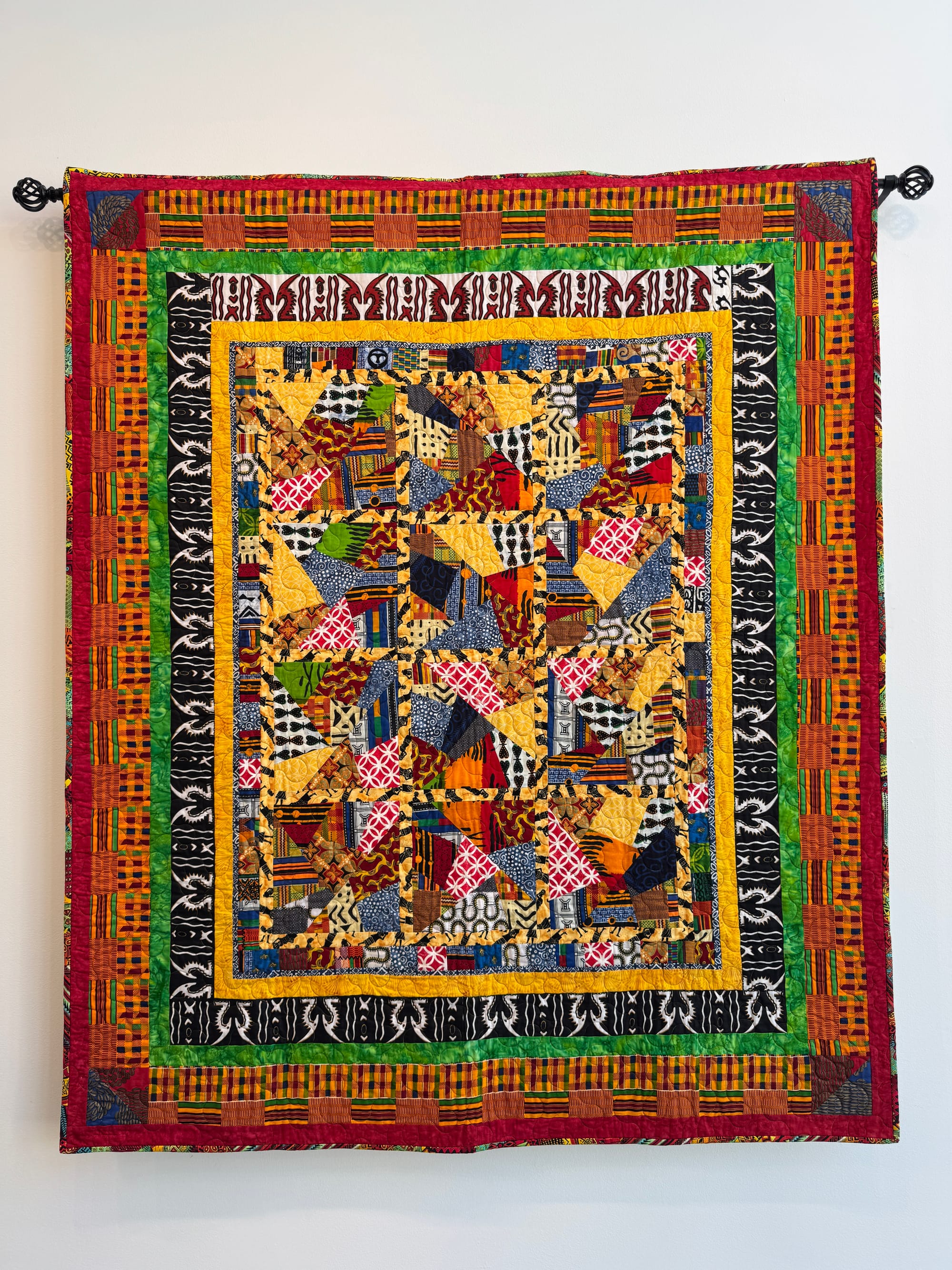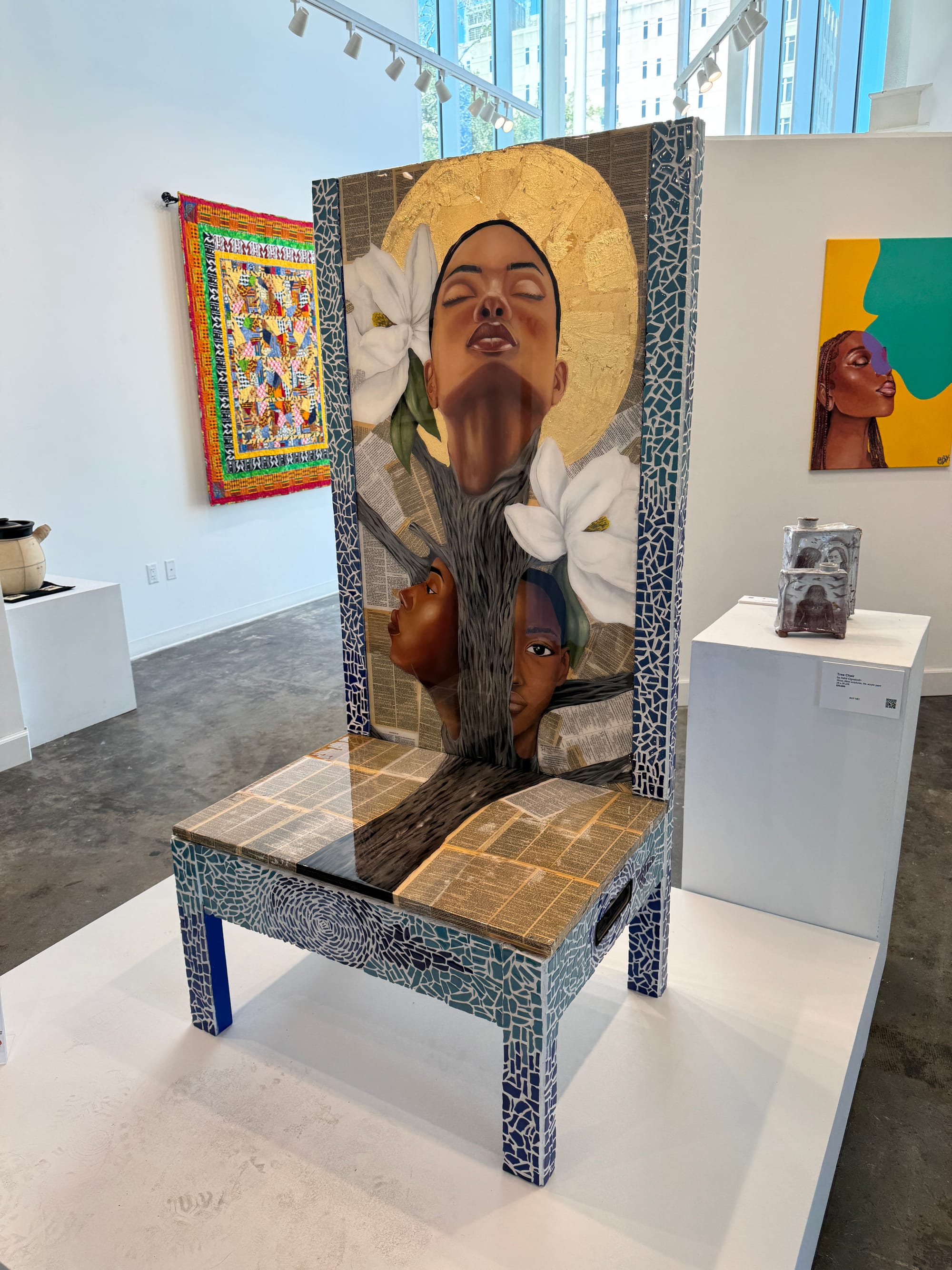 The wall on the right front of the gallery features mainly local artists and many of the pieces are on sale. Toward the back, there’s art from further away with more full informational panels about the art and the people who created them. For example, Nana Naima Wares-Akers, the artist/activist behind the quilt cofounded Kuumba Afrikan American Quilting Guild which preserves quilting traditions and community stories through textile arts. I found myself longing for that kind of background about the local artists whose pieces are simply labeled with the title, artist, medium, dimensions and price tag.