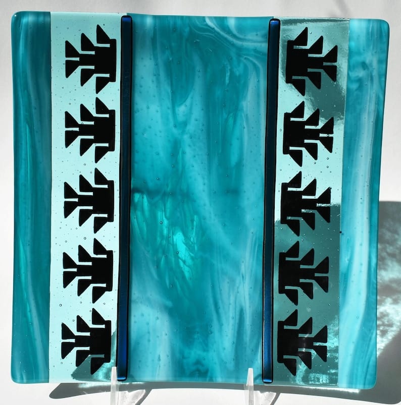 “My mom learned this technique of fusing glass, and we do it in layers. I do designs with powdered glass mixed into a medium, the glass is colored with metals and minerals, and the powdered glass is adhered to the surface of clear glass and layered on top of colored glass, in a mold. That’s then stacked into kiln and heated to 1,500 degrees, and that makes everything into a solid piece of glass,” fashioned to functional purpose as serving plates, trinket plates, bowls, and the like. “They’re not microwave safe, but they are food safe.”