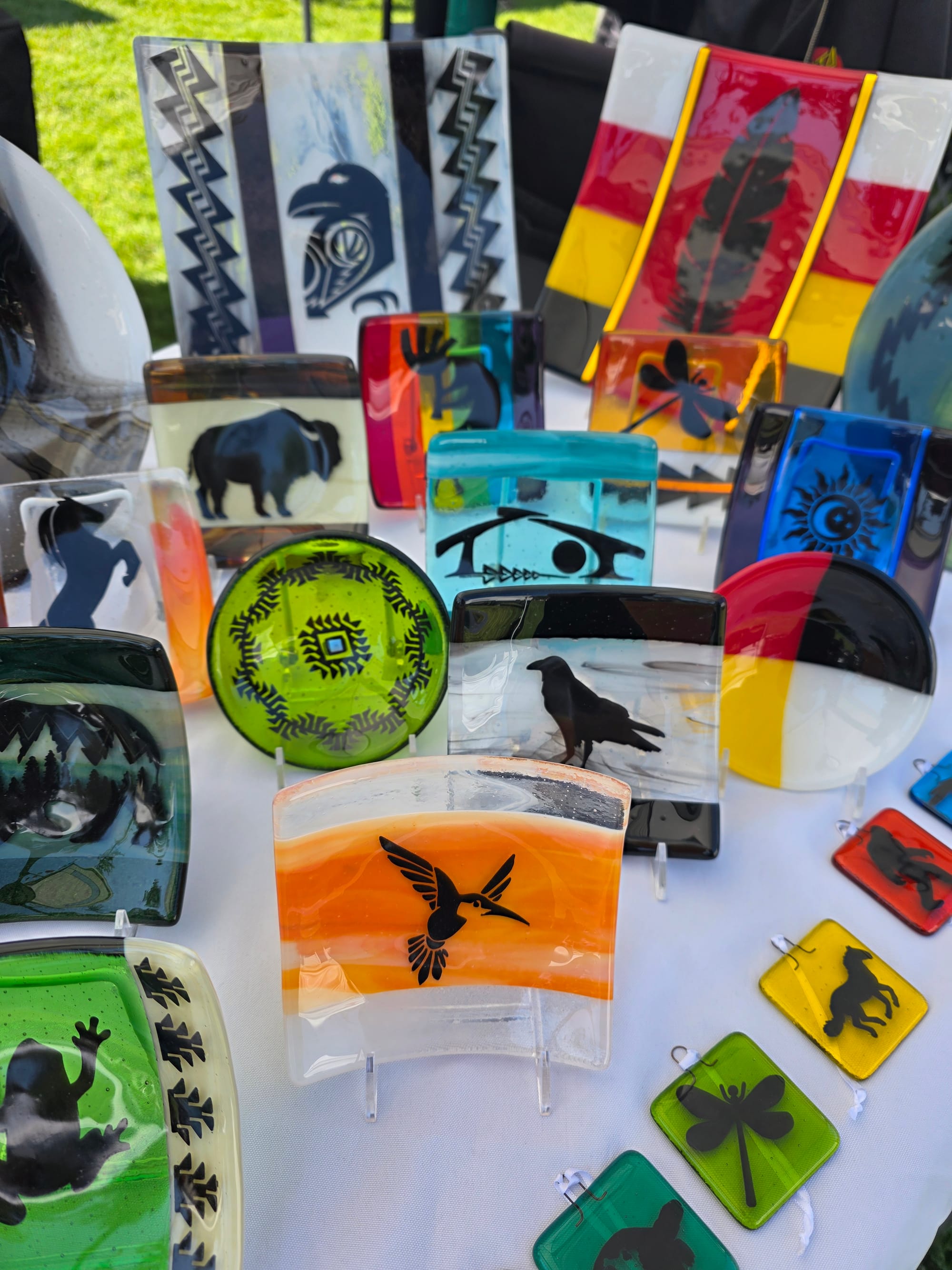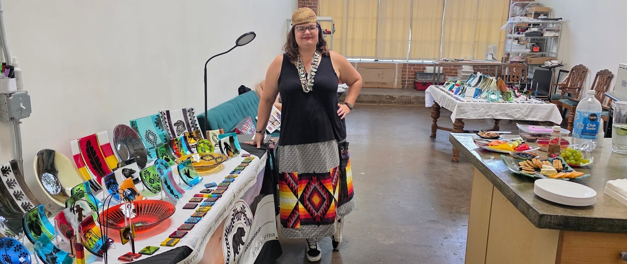 It’s telling, how I get there: find the fortress of a big brick building just off the eastern end of the Bay Bridge, beep myself inside, and make my way along a long labyrinth of intersecting colorless corridors until my wandering walks me closer and closer to the welcoming whomp of a powwow drum, drawing me into California Native Glass’s work and display space, with Carina King ready to share it all.
