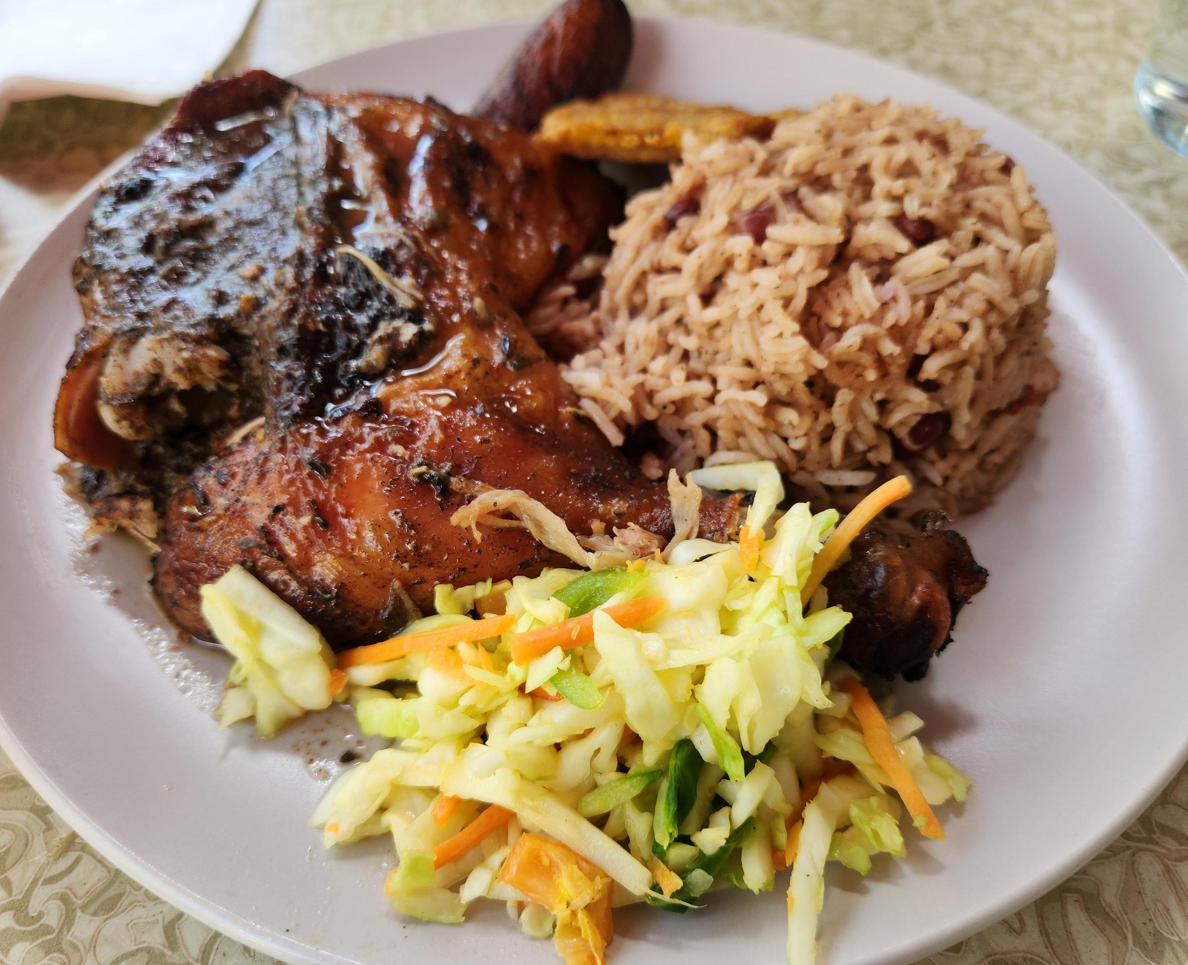 The jerk chicken was served with the same sides, each of us with one piece of perfectly caramelized gooey sweet plantain and one lovely, salty tostone.