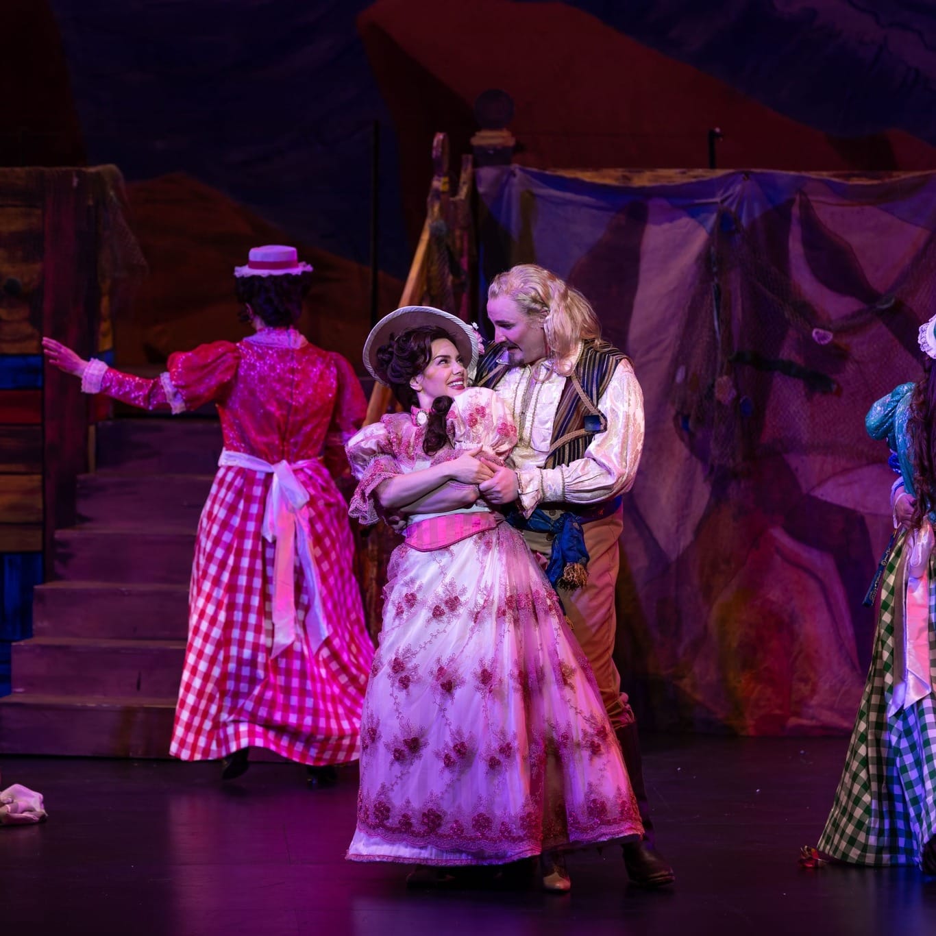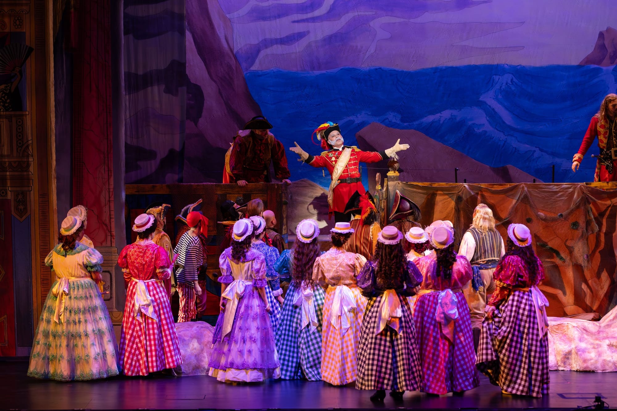 I loved the totally unnecessary moments—an extreme light shift during an extra-dramatic recitative, a random pop-up tent brought in by one of the daughters on an outdoor jaunt, a leaf blower that made the Pirate King’s hair waft in the breeze and returned later to waft some greenery around, avocado face masks during a nighttime scene with the young ladies in pajamas—that brought fresh and truly absurd energy to the period setting, without feeling tossed off. And Summer kept the performers moving—climbing on top of pirate chests and garden benches, bustling up and down steps, mass-twirling parasols, shifting back and forth across the stage—with creative blocking that played well with the perpetual motion of the music and the plot.