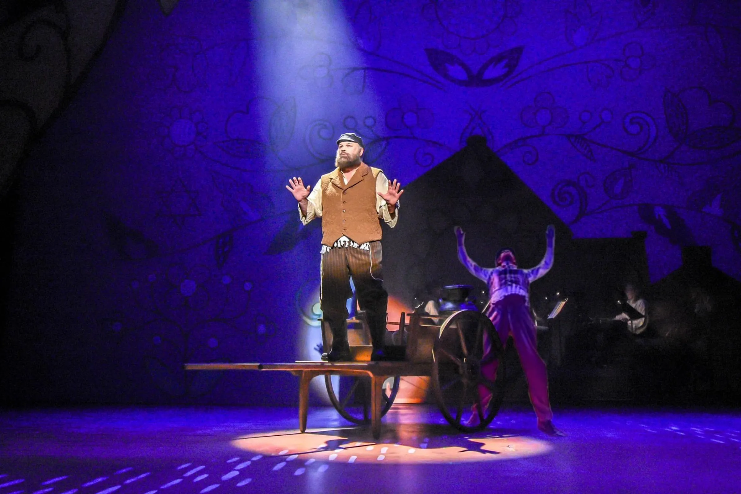 I loved seeing staff who do so much for other companies step out of service mode and into the creative spotlight — in this case, one literally designed by TPAC house electrician Carson Decker, whose alternately peachy-warm and turquoise-cool lighting gave us subtle sunrises and sunsets throughout the production. During “Sabbath Prayer,” he beamed in shafts of light from above as three families gathered with real candles below — a beautiful visual for a moment where, in this fictional shtetl of Anatevka, human devotion and divine blessing meet. (Fiddler is based on stories by the late-19th-century Yiddish/Ukrainian author Sholom Aleichem.)