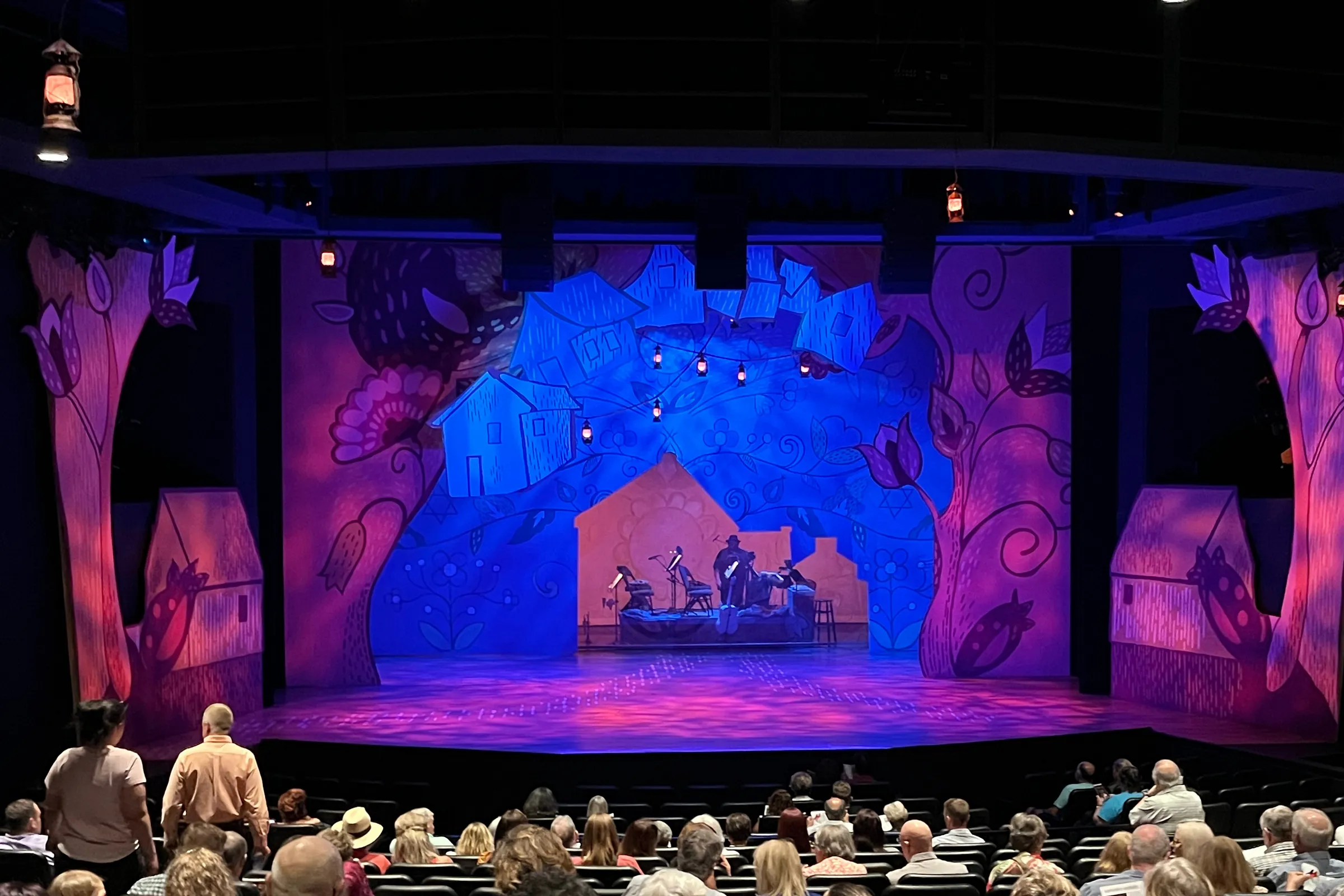 A charming set by Robin Vest (read her impressive résumé here) surrounded the action with large-scale flowers and houses, hung the Williams Theater’s ceiling with lanterns, and tucked a seven-piece band into the heart of the stage. Well-worn tables and benches signaled interiors. The traditional costumes (by Alice Wegley and the late Bruce Lewis) were color-saturated and richly detailed, though the white ankle socks Tevye wore in the dream sequence looked a little more “Costco 2024” than “Russia 1905.” Accents ranged from the Jersey Shore to the Old World (with “v” for “w,” etc.), with most settling somewhere in the middle. The fiddler of the title, performed by Allison Johnston, was a minimal but potent presence (now perched in a high stage-left alcove, now leading Tevye into the dark on an empty stage): a reminder, Tevye says, that “here in our little village of Anatevka, each one of us is a fiddler on the roof, trying to scratch out a pleasant and simple tune without breaking our necks.”