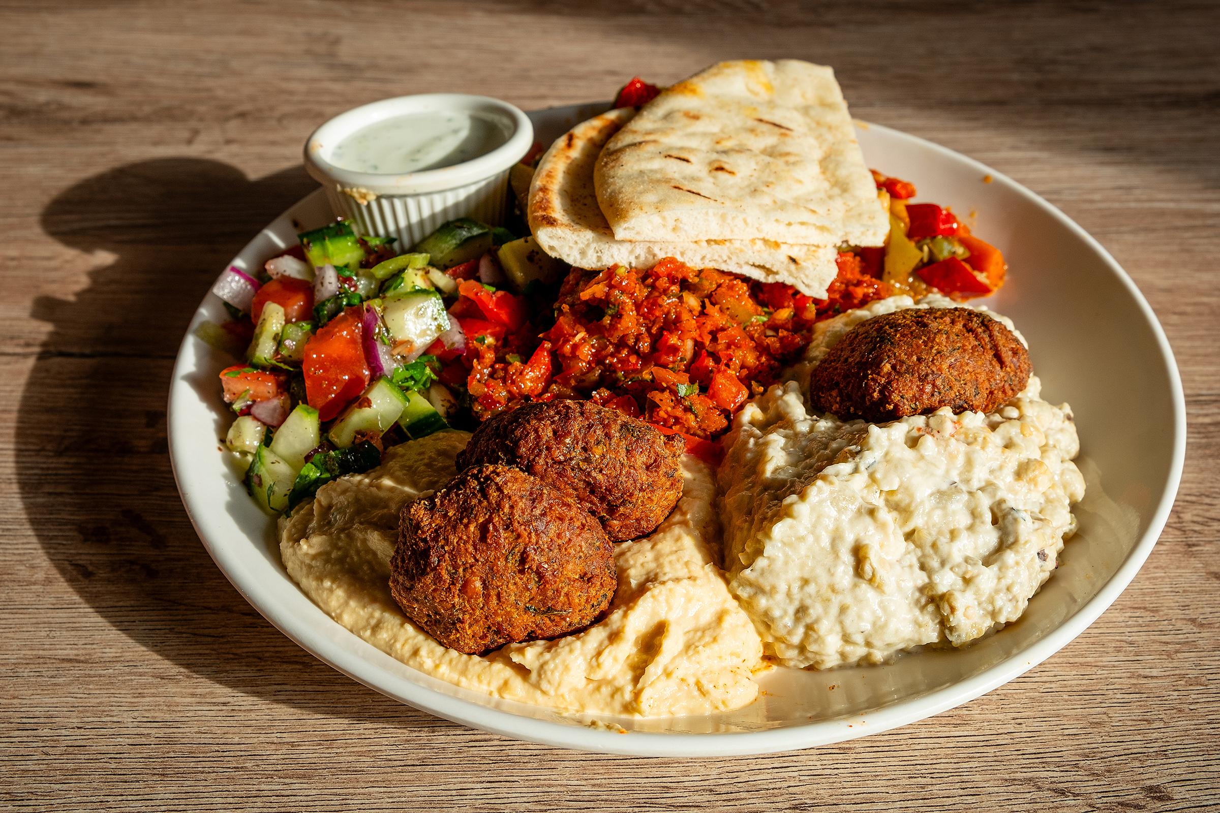 The Lazuri veggie bowl arrived within minutes of the tea. This option is a generous mezze platter, featuring falafel, veggie casserole, hummus, baba ghanoush, ezme, shepherd salad, pita, and cacik. As it neared us, we were enveloped in the tantalizing aroma of fresh herbs and spices, a symphony of flavors we were only too happy to experience.