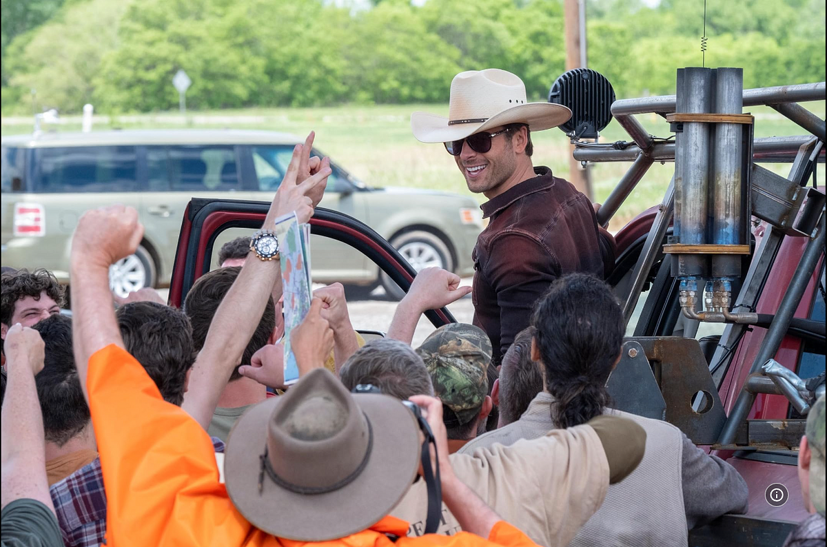 That’s where she meets Tyler, played to great effect by Glen Powell. Tyler leads a team of rough-and-tumble “storm wranglers” as they call themselves, who in contrast to the methodical scientific approach of StormPAR, live stream their storm chasing shenanigans such as shooting fireworks up the funnel.