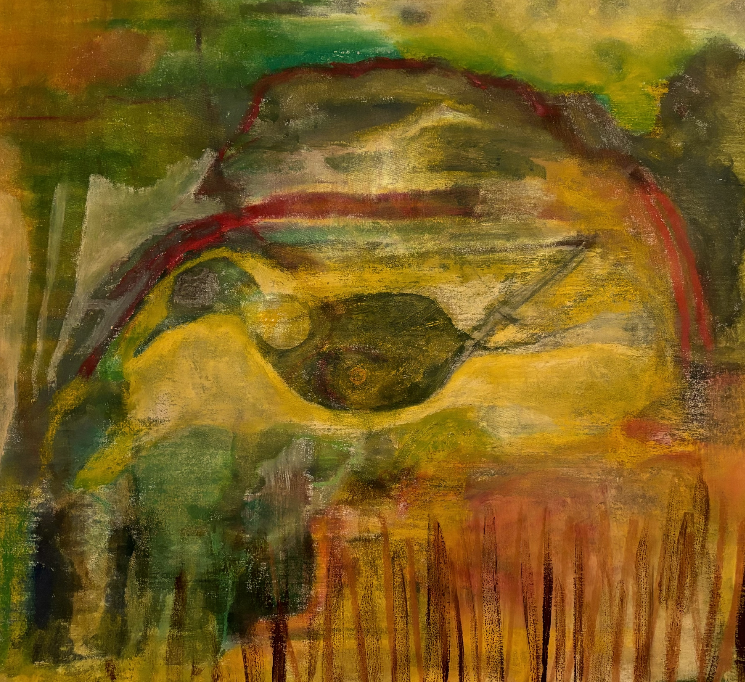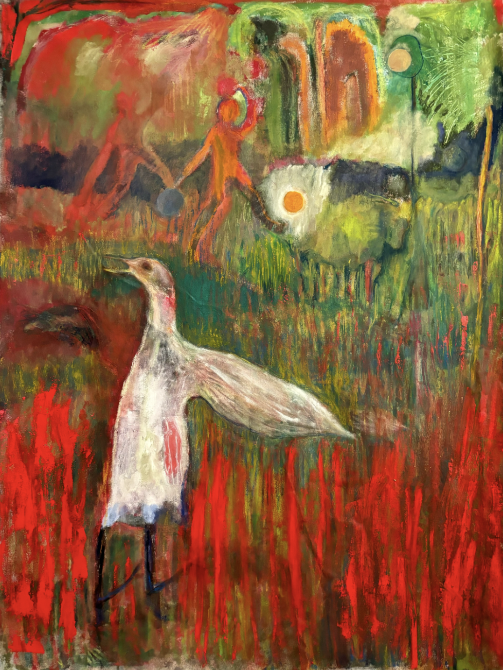 At the foreground of the composition is a white goose, its teardrop-shaped wing outstretched and its bill ajar, as if crying into a distance the human observer can’t see. The bird is shrouded in feathered stalks of grass the color of angry coral; behind it are human silhouettes, balancing balls between them like circus seals. The spherical motif is emphasized by a fried-egg cracked into the center of the canvas, like a golden pupil encased in a cloud of sclera.