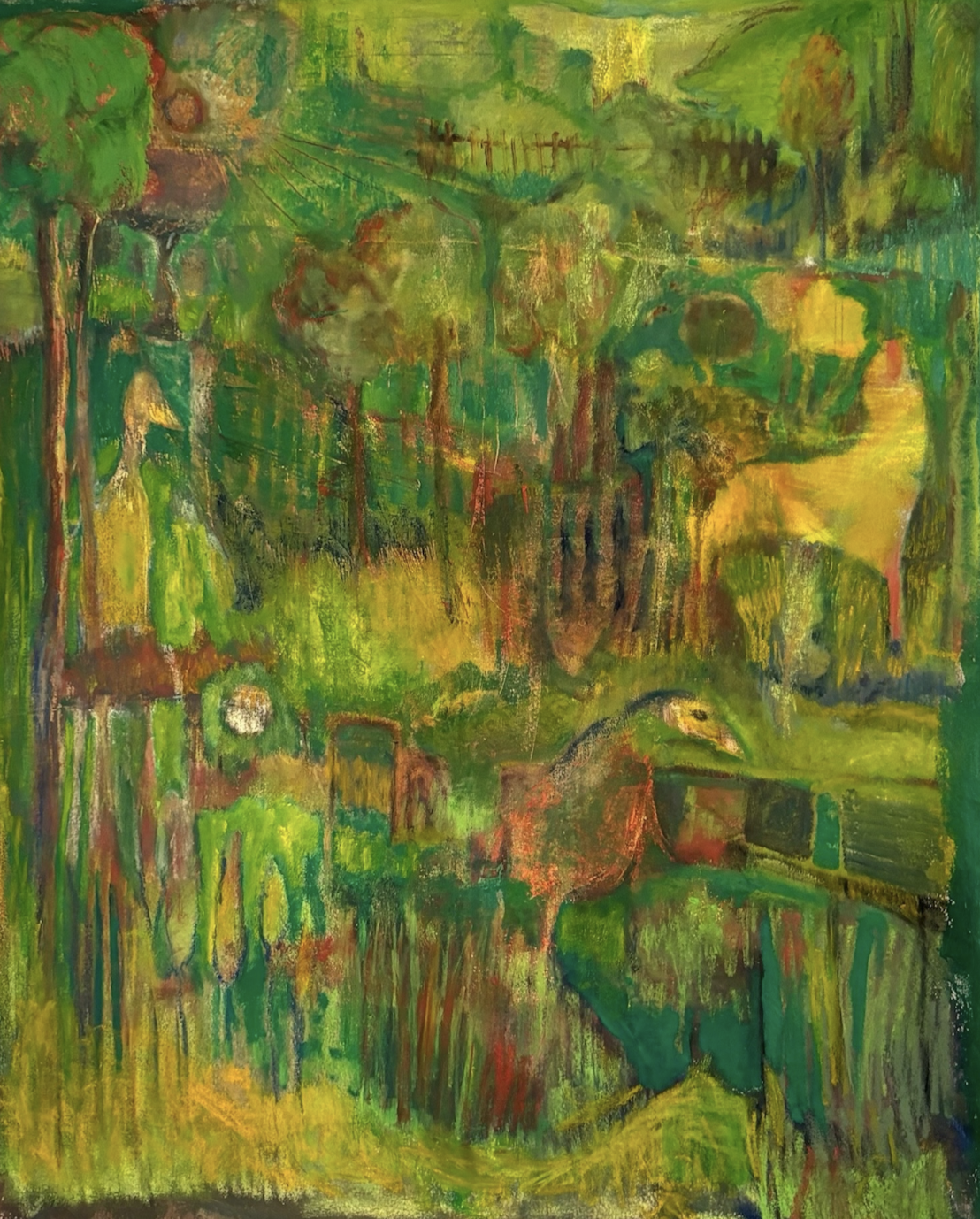 Tsipori uses oil paint and pastel to portray a bucolic, Basquiat world in which winged animals figuratively dominate. Among pieces like “Birds' Paradise,” a bustling green farmland full of abstract fences, beaks and branches, and “Embryo,” a solitary study of a fetal bird with a yolk at its throat, “Flightless Bird, Looking East” stands out as the titular work that steals the show.