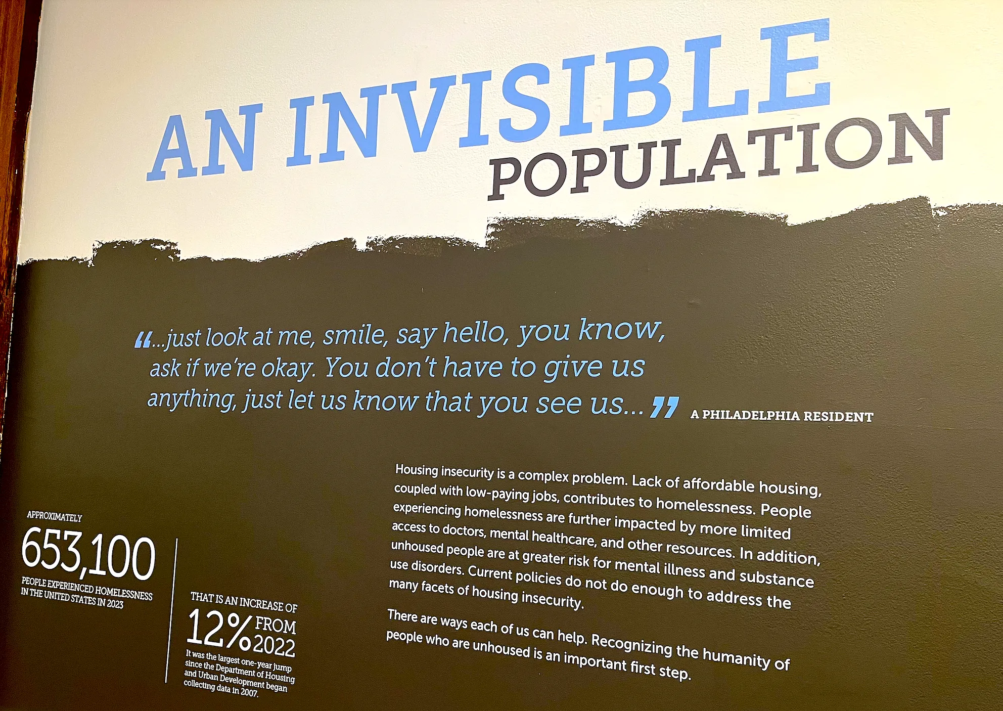 Maybe I’m wrong, and museums play important roles in reminding the general public that the unhoused are not satanic manifestations to be ignored like the plague. But I believe the homeless are so often described as an “invisible population,” as the Mutter wrote on their own walls, because we live in a systemically inhumane society that wants to squash humanity in service of consumerism.