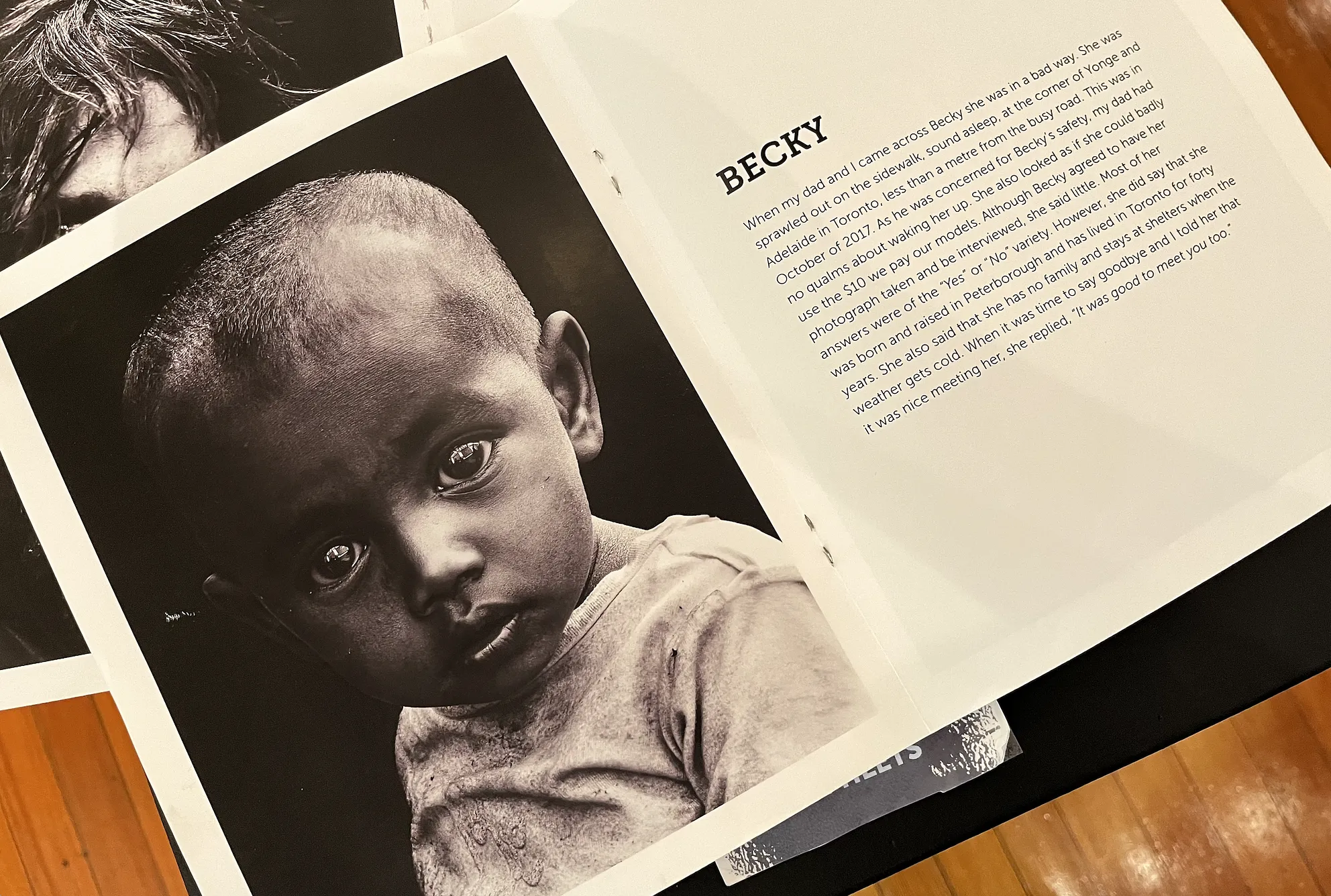 The portraits, tessellated into a stylistically uniform family-tree-style mural, are beautiful, bold and accompanied by a book full of paragraphs recalling brief, first-person interactions with each of the individuals pictured on the larger wall. Some of the images are tragically startling — like a photograph of a wide-eyed baby from Kolkata, situated in the ostensible reference book next to a short essay about a different person named “Becky” whom the photographer recalled waking up to check on her health before offering $10 for a photo op. I later figured out, through den Bok’s Instagram, that the real subject was a 2‑year-old called Bani who was living in the slums with her siblings and mother.