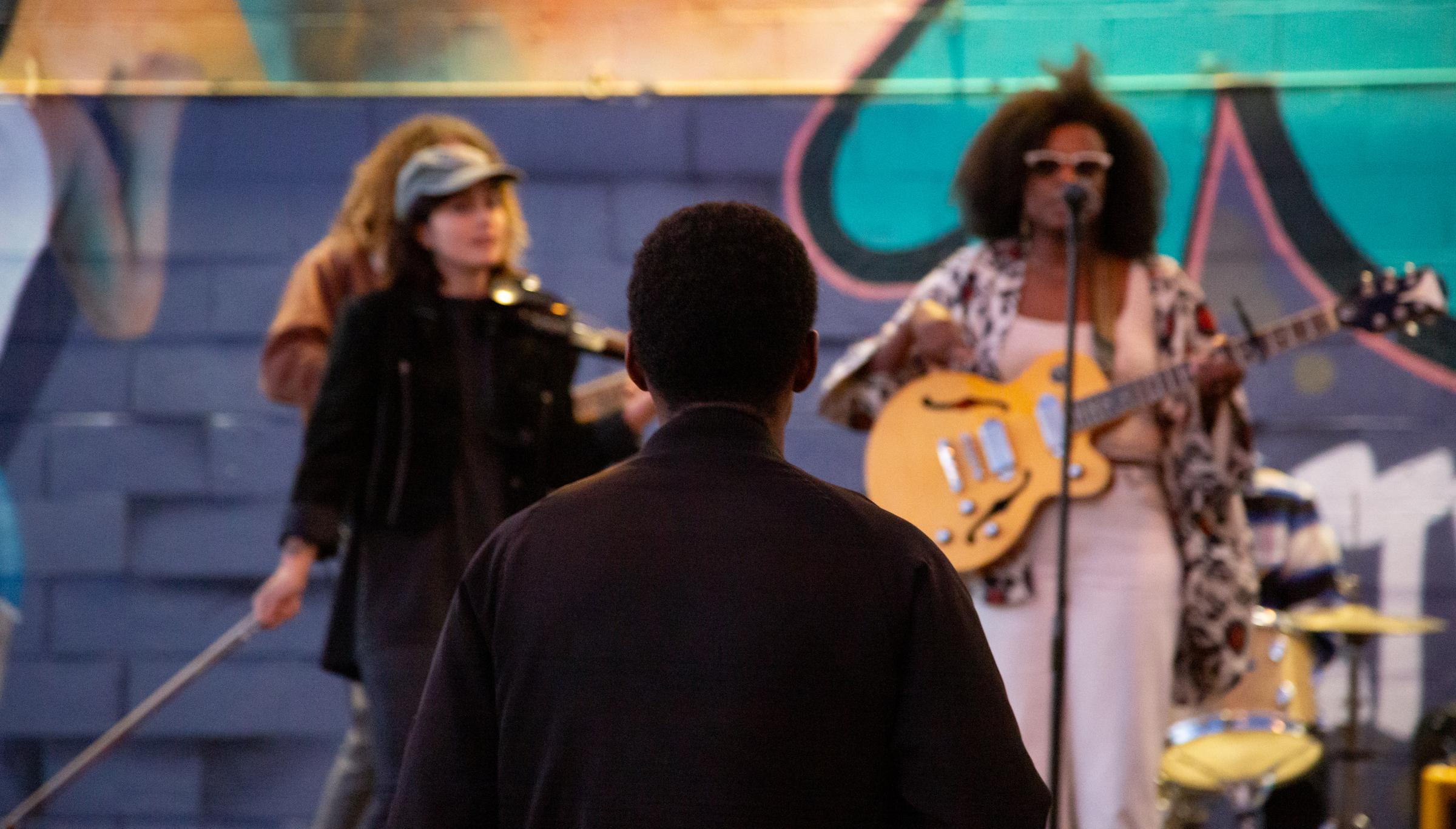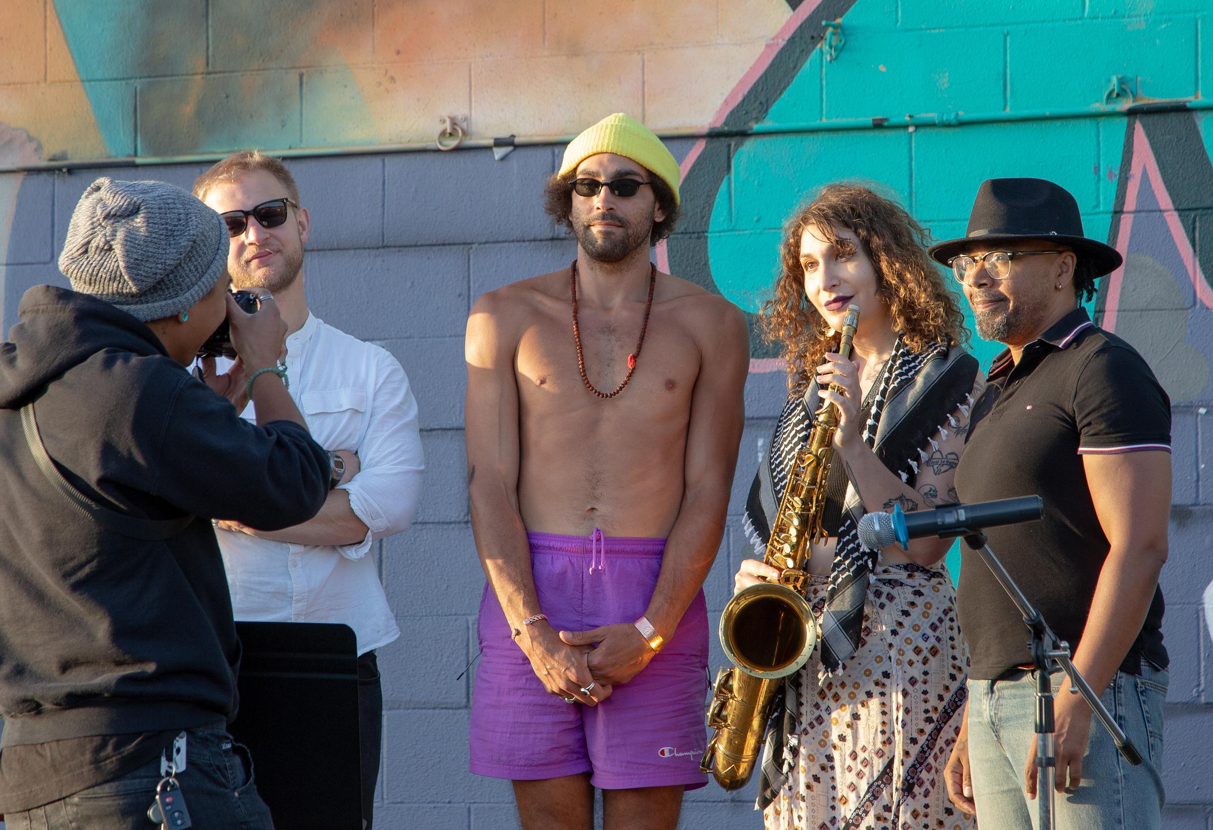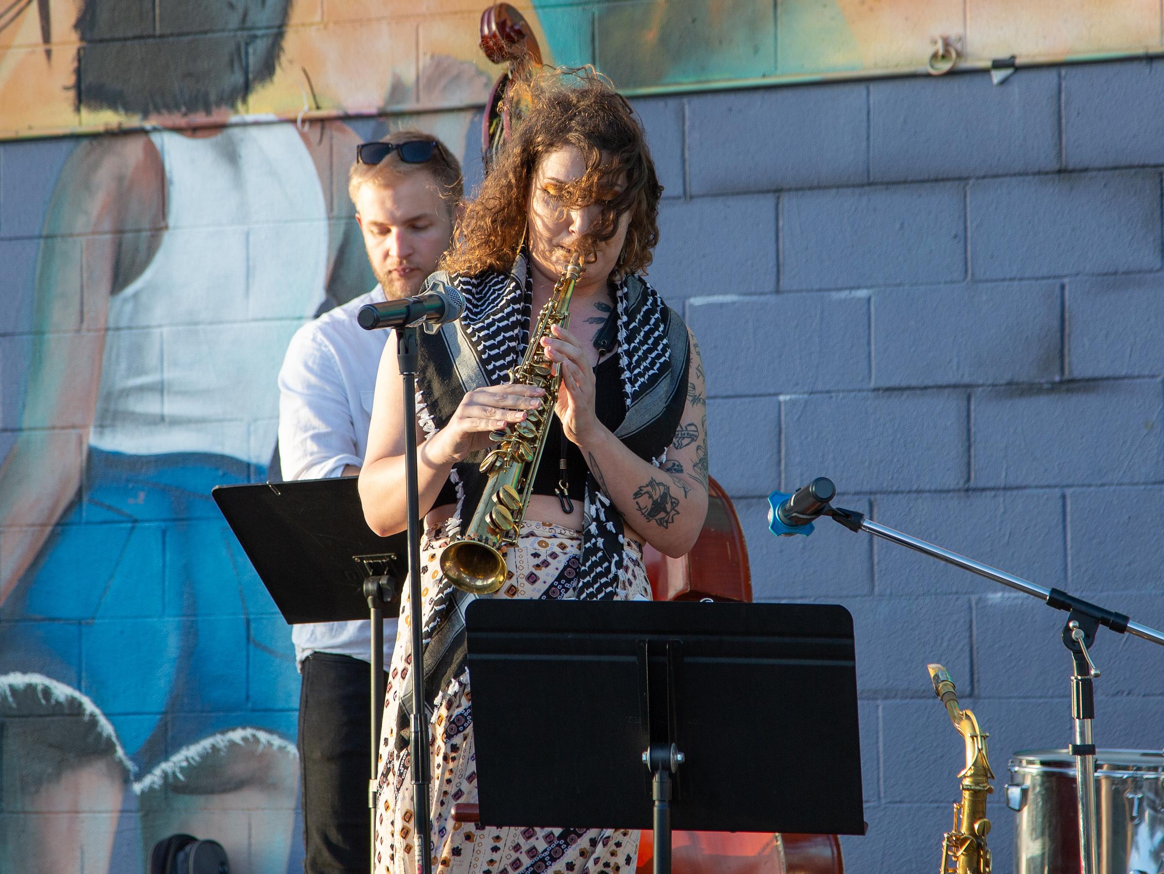 Small sunglasses, a neon yellow beanie, eye-shocking magenta sporty shorts, pale yellow socks, and black dress shoes: thusly clad, a drummer wailed on his kit. Along with a bassist and guitarist, they backed saxophonist Nora Free of the Nora Free Liberation Quartet, and were the opening set of the second installment of Sidewalk Sessions, a free monthly music and community event held in the backyard of 7th West.