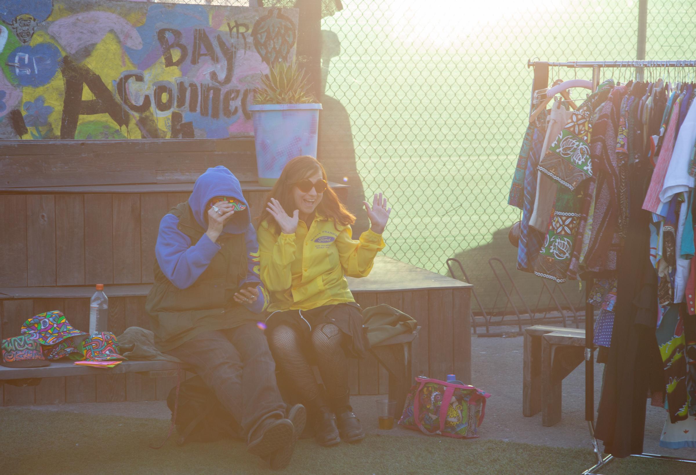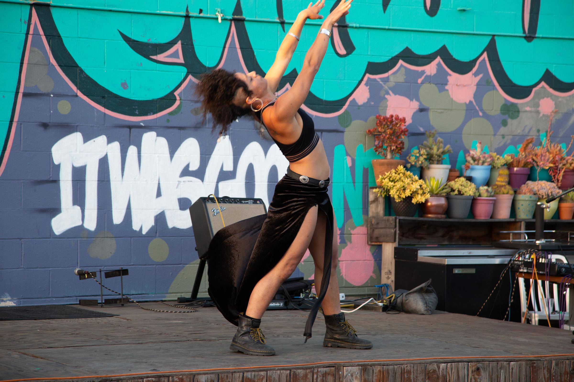 Noel, who had indeed been one of the folks bopping along to Free’s set and the interim songs pumping through the speakers, entered the stage calmly, their midriff and strong legs bared to the chillier-by-the-moment breeze and golden hour’s sinking rays. The performance alternated between spoken word poetry delivered standing static at the microphone, and expansive, undulating, and precise movement across the small stage. The BART train’s screeching crescendoed as Noel wove their body, speakers intermingling with the metal-on-metal. The poetry portions, laden with reverb, were deeply personal and simultaneously universal, hopeful and dreamful, looking towards the beauty in the drudgery of daily life. Noel’s pleasure in their work was palpable (and selfishly, I love a ham when I’m behind the camera!) and got the small crowd cheering heartily by the end.