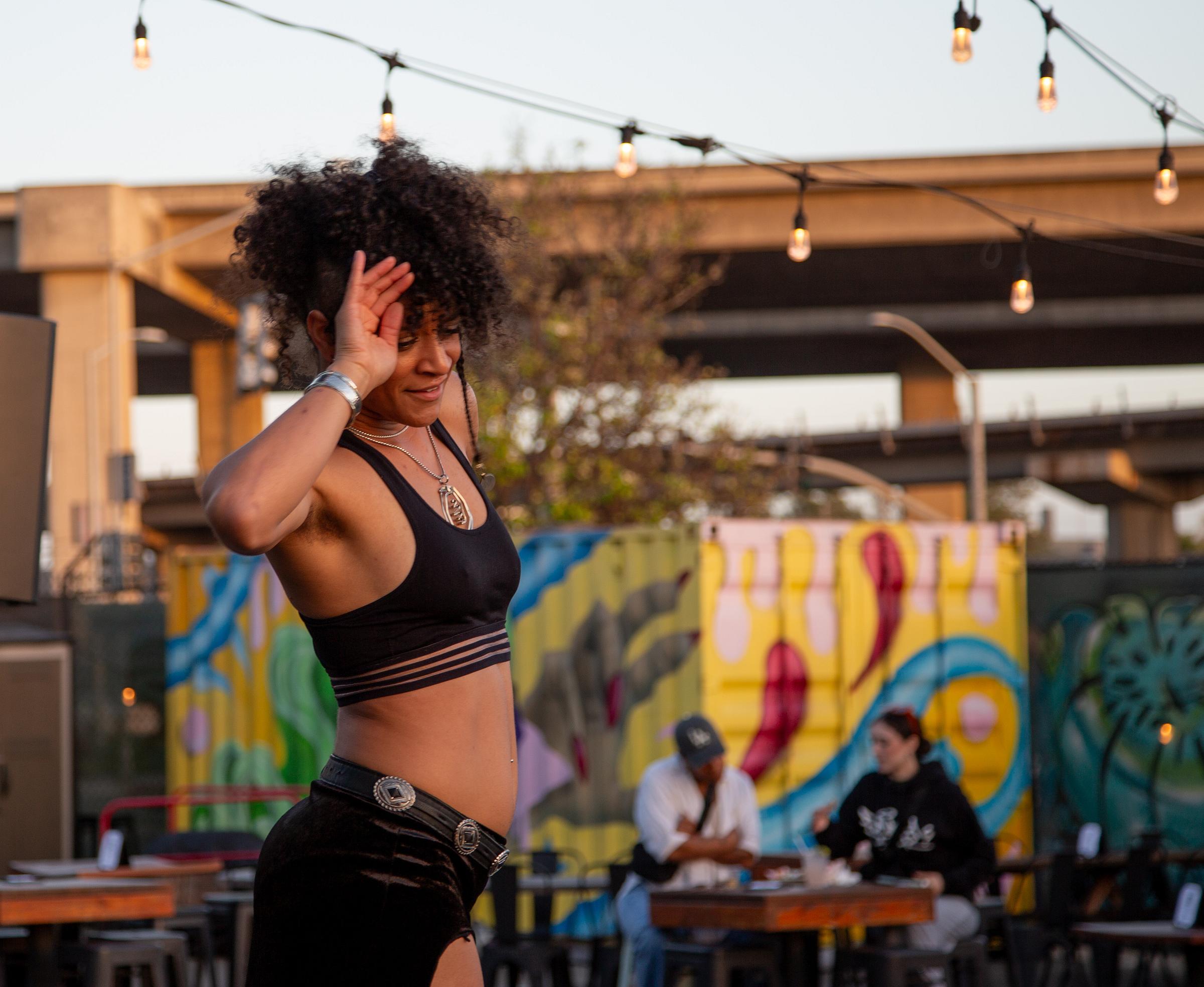 The band finished their set, and the host for the evening, Natalyn Daniels, with Kehlani’s perky cheeks by way of Timothy B’s paint job peeking from behind, welcomed us. A round of applause ensued for Free, a reminder to greet and peruse the stands of the local businesses present, and then an intro for the next act: poet and belly dancer Rachel Noel.
