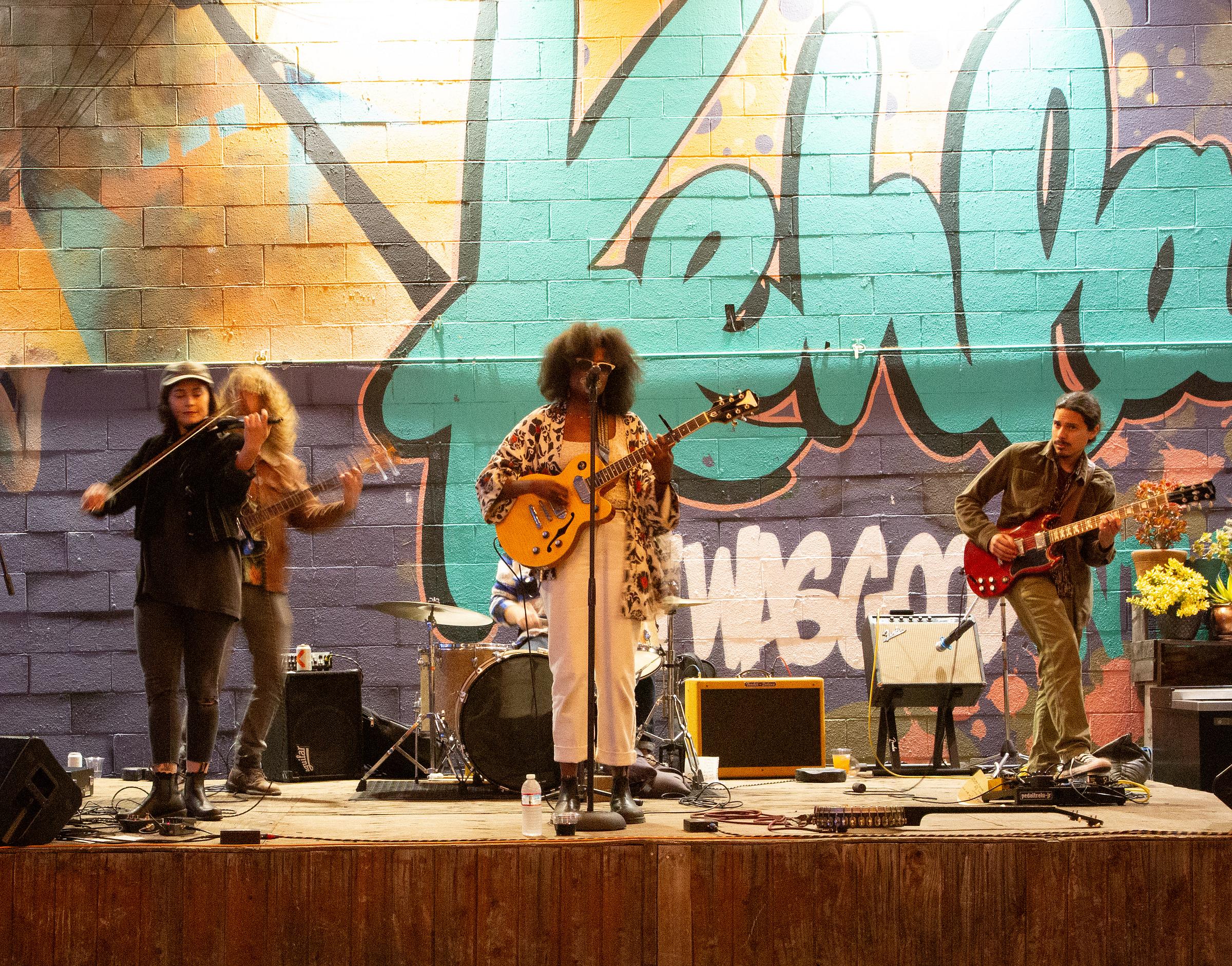 Jazzy, loose but in complete control, the four serenaded a sparsely populated yard, dotted with a dozen patrons — or are they performers? Plus one child, and vendors from three fellow 7th St. businesses.