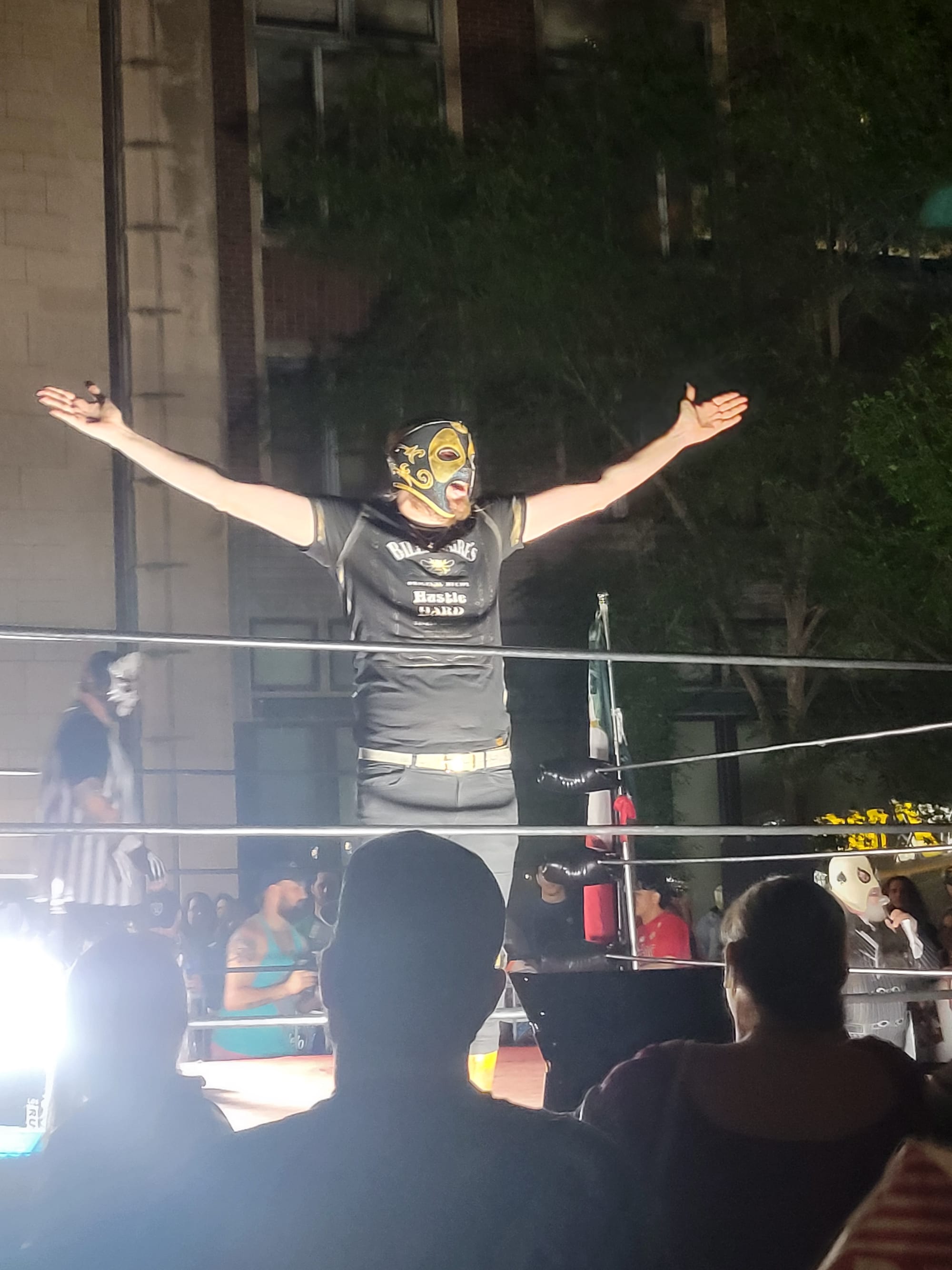 Almost every combatant was a mascara this year. Even wrestlers who normally compete without a mask donned one for the occasion, such as “The Spotlight” Logan Knight, who wrestled under a mask as El Hijo de la Luz, and local favorite Mr. Nasty, who appeared as the masked Super Nasty Nasty. Some of the competitors sold wrestling masks alongside their merch on the sidewalks; kids walked around wearing these as well as paper masks decorated with markers.