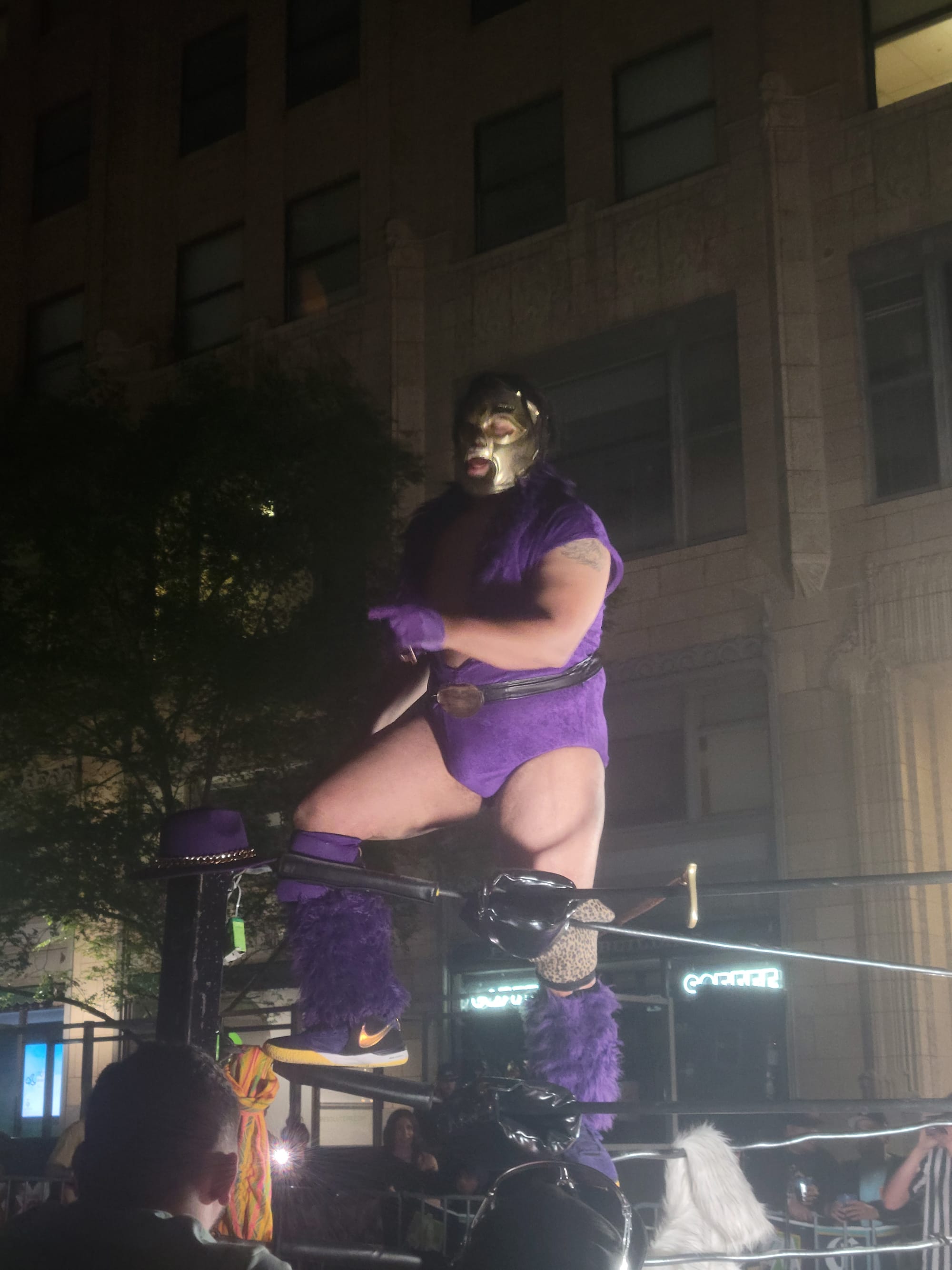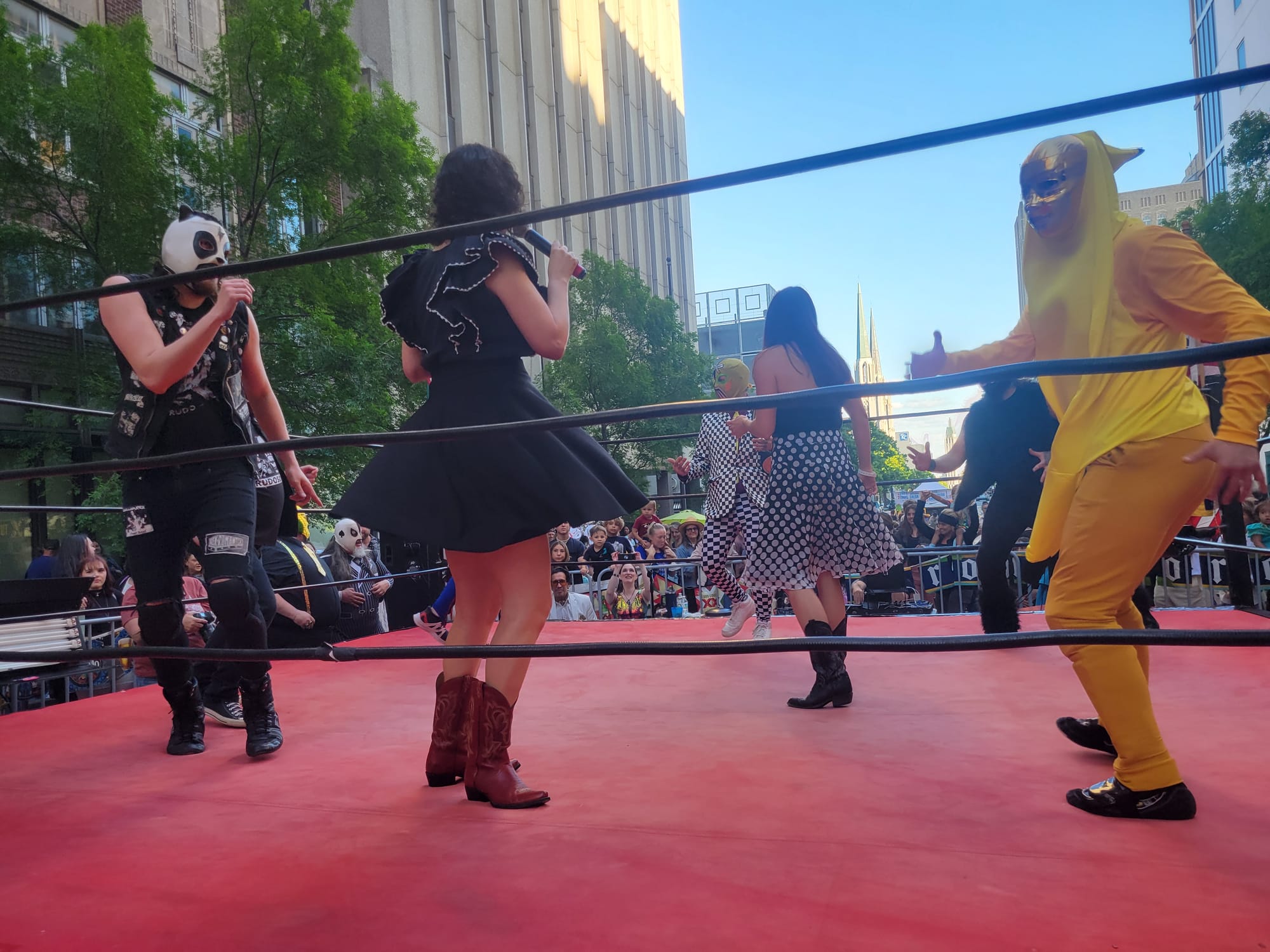 The weekend’s other most incredible spectacle happened on Saturday evening. Between matches, instructors from Giddy Up Two Step taught the crowd a partnered line dance while several of the masked wrestlers filled the ring to help demonstrate the moves. One of these wrestlers—dressed as a banana and wearing a yellow-gold mask—froze in fear halfway through the lesson when a gorilla began hungrily circling the ring. The gorilla found a seat next to the commentary booth and settled there for the remainder of the dance, but the banana had trouble concentrating from this point on.