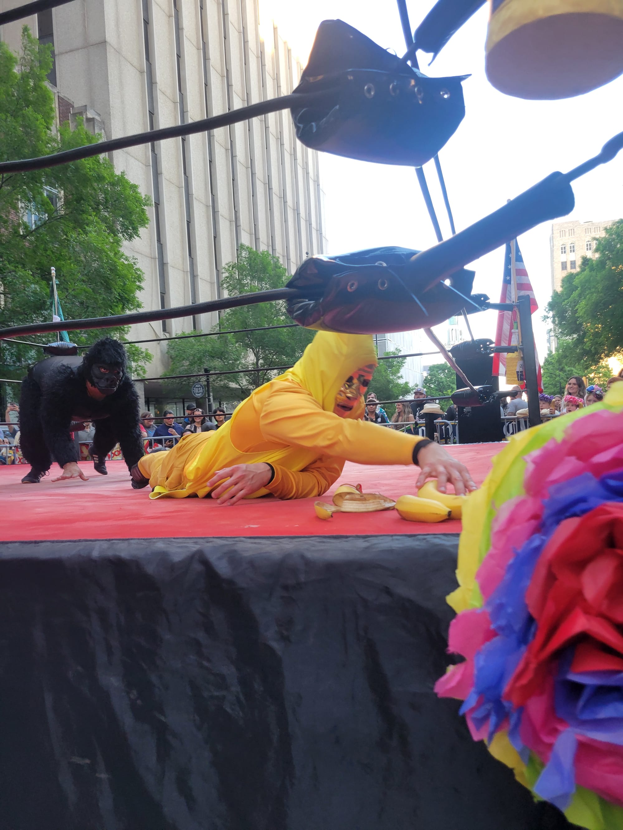 Gorilla seemed to have the advantage. When he backed a grounded, mushed Banana into a corner, the match seemed decided. But Banana had one last trick: he pulled out his one remaining banana and offered it to his foe. While Gorilla paused his onslaught to eat the smaller banana, the larger masked Banana used the distraction to pin the ape and win the match.