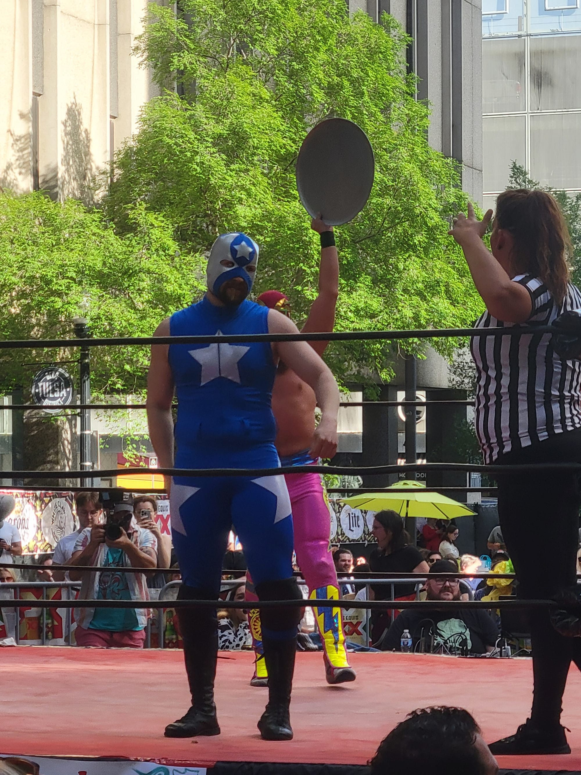 During several matches over the weekend, whenever our heroes were hurting, the crowd rallied together and helped them power back up. On Saturday night, the heel wrestler El Gallardo Uno borrowed my chair to use as a weapon against Dove Puro, but when he was done with it, his masked manager politely returned my seat to me. On Saturday night, a wrestler named Party Boy Tommy saved us from a crew of masked pirates, and on Monday afternoon, he defended the honor of Hornsby (yes, the Tulsa Drillers mascot was in attendance) when he was accosted by another wrestling blue bull. On both occasions Party Boy Tommy fought with only one hand, an ice cold beer in the other.