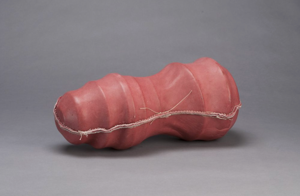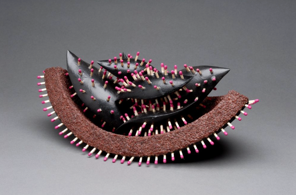 Most of the other whittled objects found their weirdness through the integration of alien qualities. Needles, for instance, as seen on the porcupine or sea urchin, were common motifs. In “Art Object to be Destroyed,” a piece by Hilary Pfeifer and Neil Scobie pictured above, perfectly pink matches coat what look like thick, black cactus leaves packed into a melon rind. You could compare the shape to a mouth filled with a million tongues. Excessive surface material is adorned by fire strikers, which resemble acupuncture pins but imply immediate destruction if lit.