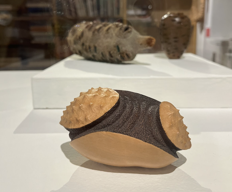In “Pupa,” a piece by Satoshi Fujinuma, the spines are much smaller, but still prominent. The spikes are seen on the shell of the piece, a lighter wood which covers a ribbed, reptilian-looking belly underneath. The spines look like they are covering the flesh of a turtle. In the dim light of the gallery, I could easily imagine the stomach breathing, in and out.