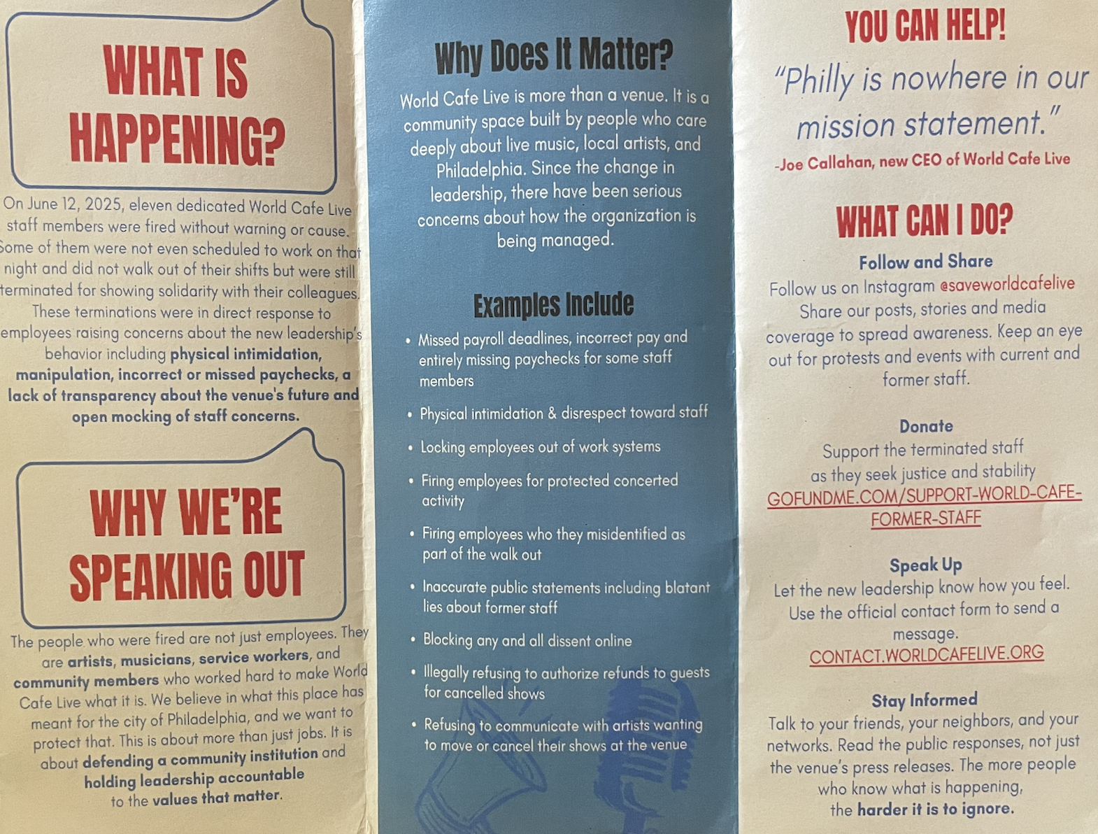 On the inside flap of the pamphlet there is a quote from the WCL’s new CEO Joe Callahan: “Philly is nowhere in our mission statement.” Whereas WCL’s polemic leadership has started preaching the potential of Artificial Intelligence to reach broader audiences, “Upstairs Neighbors” utilized their nation-wide fan base to empower local institutions and people.
