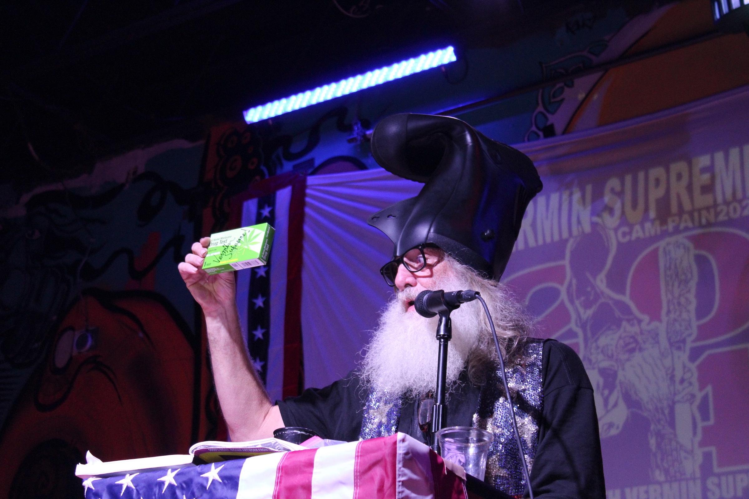 With a trademark boot atop his head, Vermin Supreme has been waging satirical quests for local and federal office for decades, including in the Republican and Democratic presidential primaries, in books and movies, and, as in Albany, in onstage performances. He kicked off the evening Sunday by greeting his constituents on the sidewalk outside the venue. He took selfies with everyone in a circle (because lines are elitist) and led the crowd — some who have followed him for years, others who know of him from viral internet videos of him at political protests — in a call and response chant: