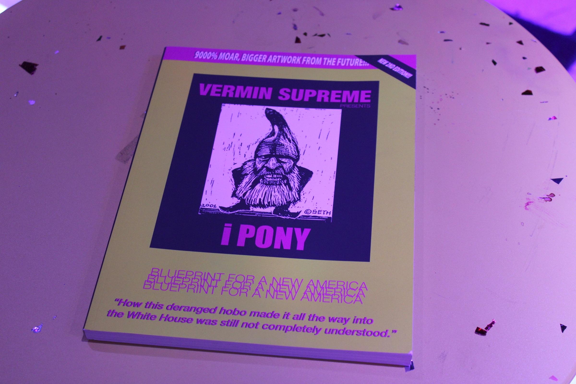 After hurling glitter at the audience, the candidate closed the evening by raffling off official campaign merchandise. The swag included patches from his 2020 presidential run, a “magic dental fetish” goodie bag, a copy of i Pony (which I won, which means I now owe Vermin Supreme a detailed book review), neckties (autographed by the candidate in glitter), My Little Pony toothbrushes, a box of unicorn Kraft macaroni and cheese, a home marijuana drug test kit, and the grand prize: a strand of the candidate’s beard hair covered in glitter. The first winner chose the hair.