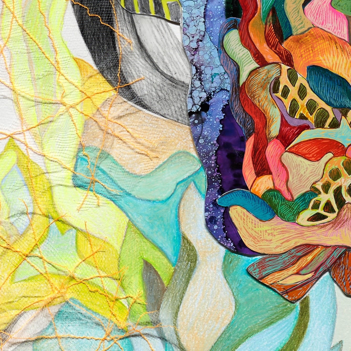 Whether Wong’s aim is to forget and be born anew or to remember in order to move forward, Full Circle becomes a personal mythology shaped by her own hand. In these works, dark lines creep inward and braid themselves around vibrant colors that resist containment, much like Wong herself. Rather than dimmed, these colors are made more radiant by the charred marks that surround them.