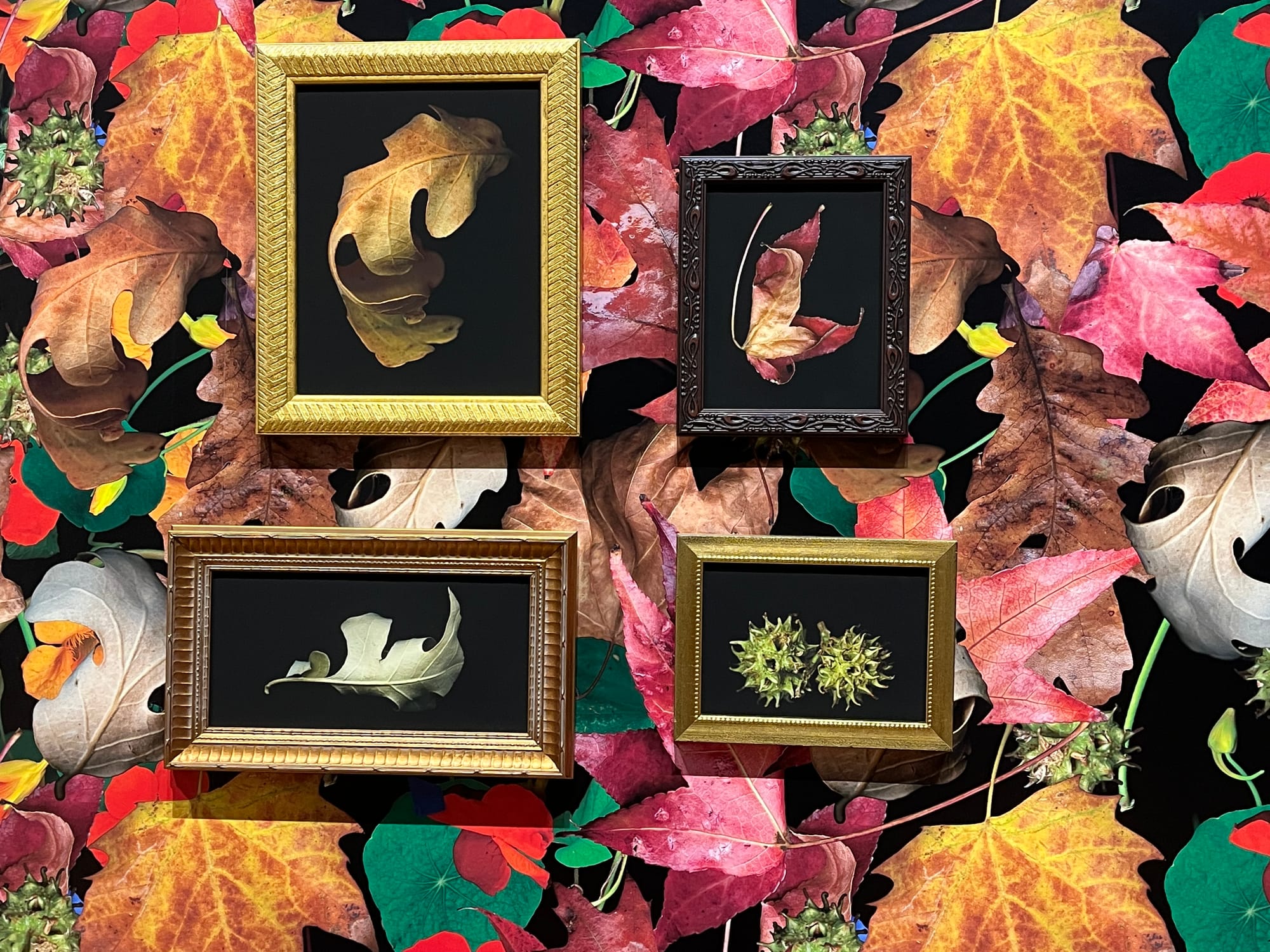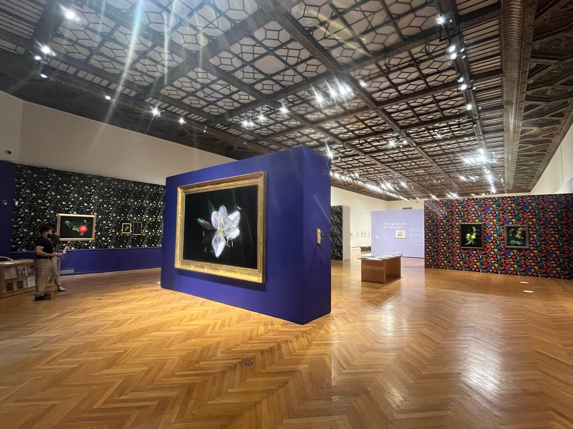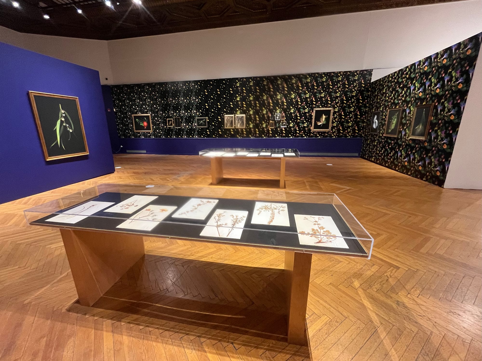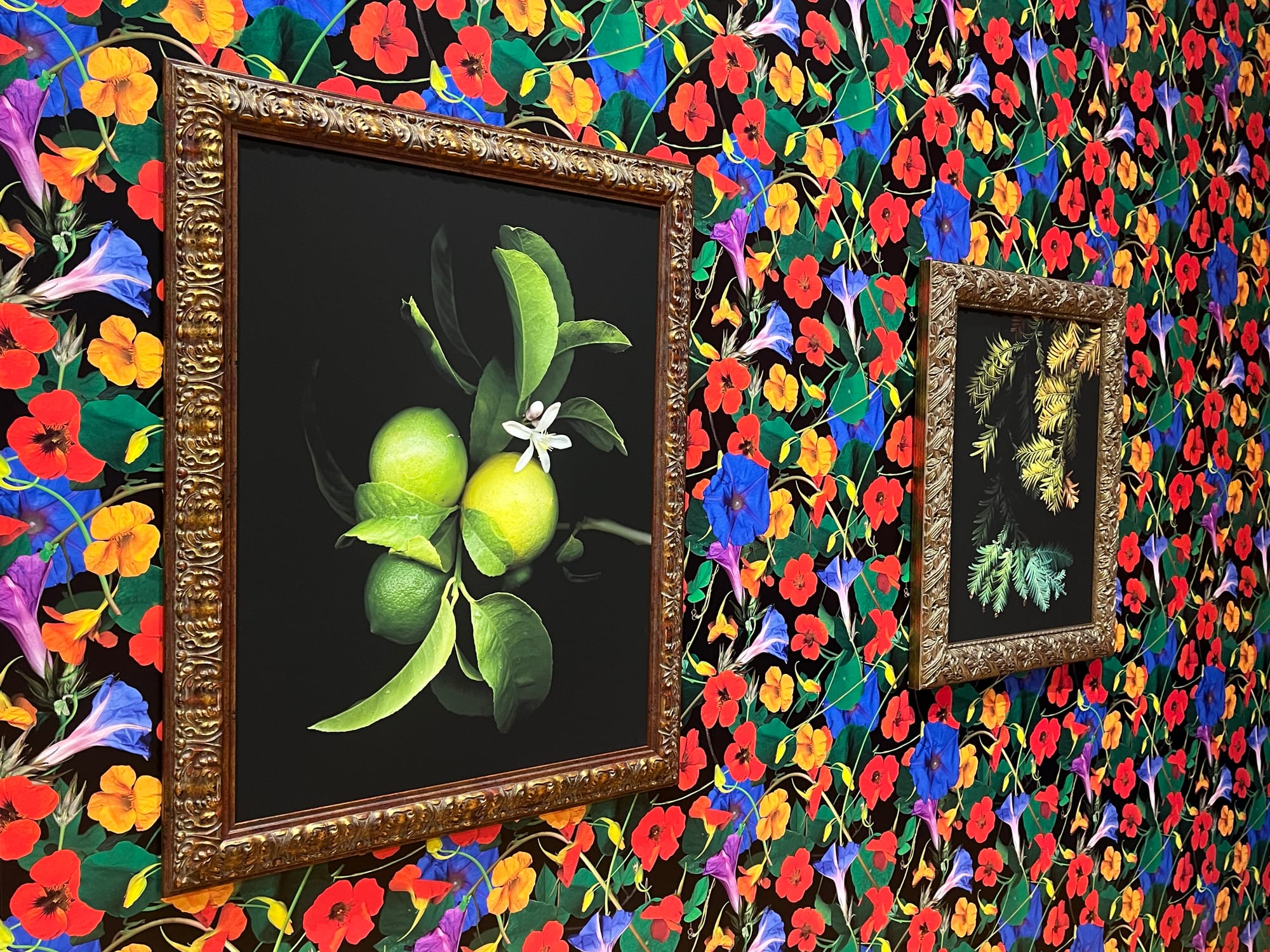 The walls of the gorgeous 100-year-old space are instead covered in dazzling floral wallpapers designed and created by Lucas herself. I counted six different patterns, each blending nearly imperceptibly into the other. The effect of the botanical photos on these walls—all in classical-style frames that evoke those that might be seen at London’s National Portrait Gallery—is spellbinding: the clash between the photos and the buzzingly busy wallpaper works in the most unexpected way. It’s a remarkable juxtaposition where less is definitely not more, both confusing and calming to the eye. The dark backdrops serve as a perfect counterpoint to the bursting colors of the walls they’re hung on. Lucas’ curatorial insight and confidence blew me away.