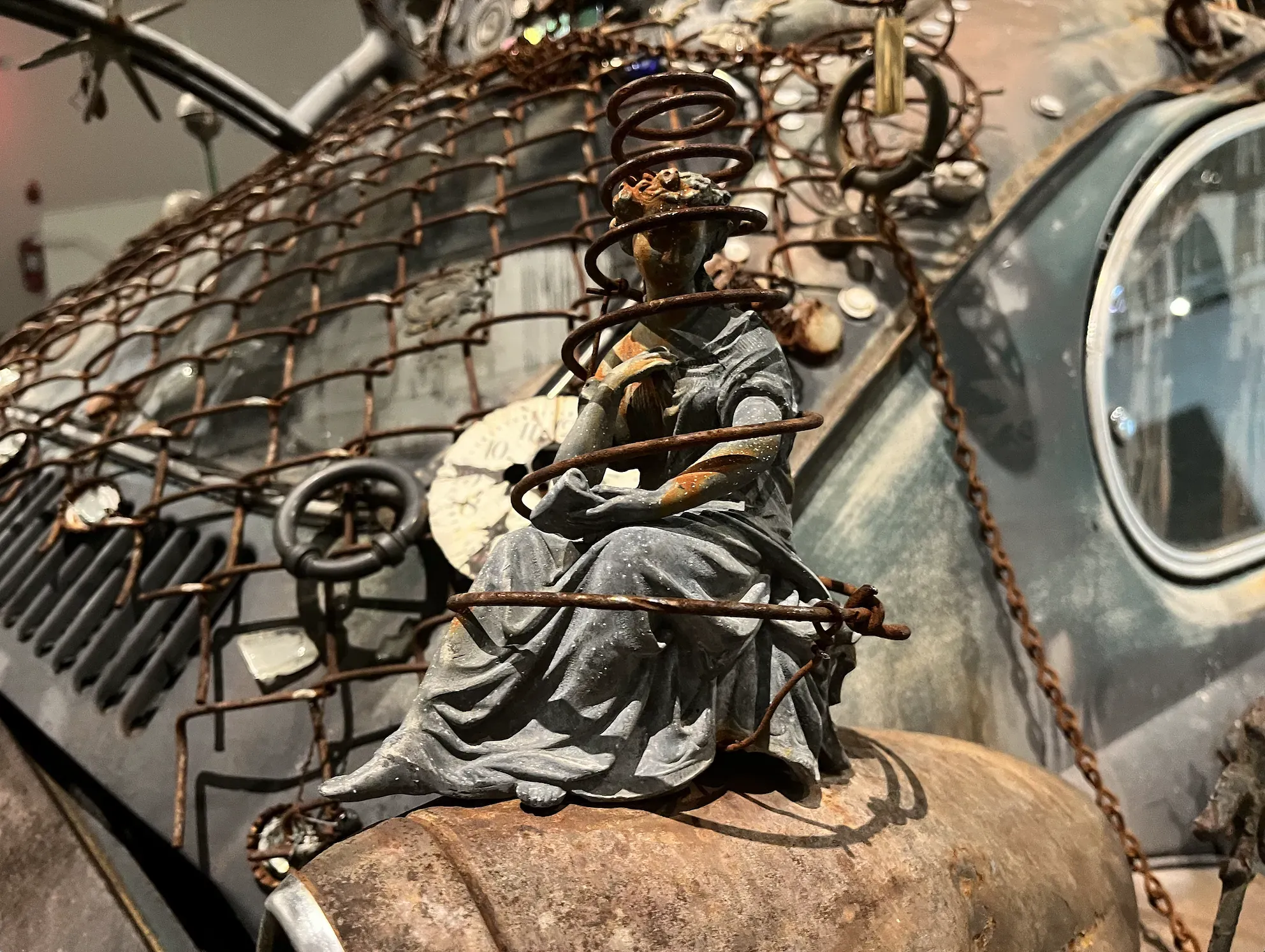 Then, of course, there’s “Art Car”, the drivable but stationary Volkswagen decorated with rusty found objects — teapots, sculptures of busts, old fencing. It is part of Bedford’s home sculpture garden known as “Vanadu,” named after “Xanadu,” the extravagant palace in Orson Welles’ Citizen Kane that portrays wealth as a facade for emptiness.