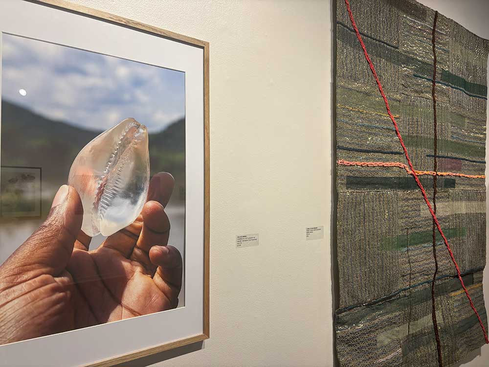 The gallery is permeated by the sound of a shifting sonic installation by Maro J. Kayira and Ethan Marshall Cohen that reacts to the number of people, movement, and sounds in the space. The pair created the installation by embedding submersible microphones in ice to record the sound of it melting. Rather than a simple loop, the installation will change as it interacts with gallery visitors.