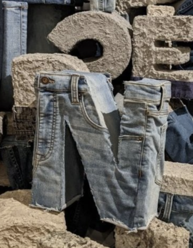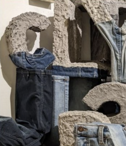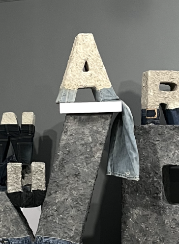 On a cloudy April afternoon, I am visiting The Arts League, a West Philly house turned arts workshop space. The Arts League hosts various classes for kids and adults while maintaining a small gallery space. Their latest show, entitled “WE,” is a collection of theatrical, mixed-media work by the artist Megan McManus. The centerpiece is something like a shopping mall gone wrong: Stacked in a pile are a bunch of gray, papier-mache block letters “wearing” jeans. Fitting rooms are rarely fun, but I venture to try on the artist’s perspective.