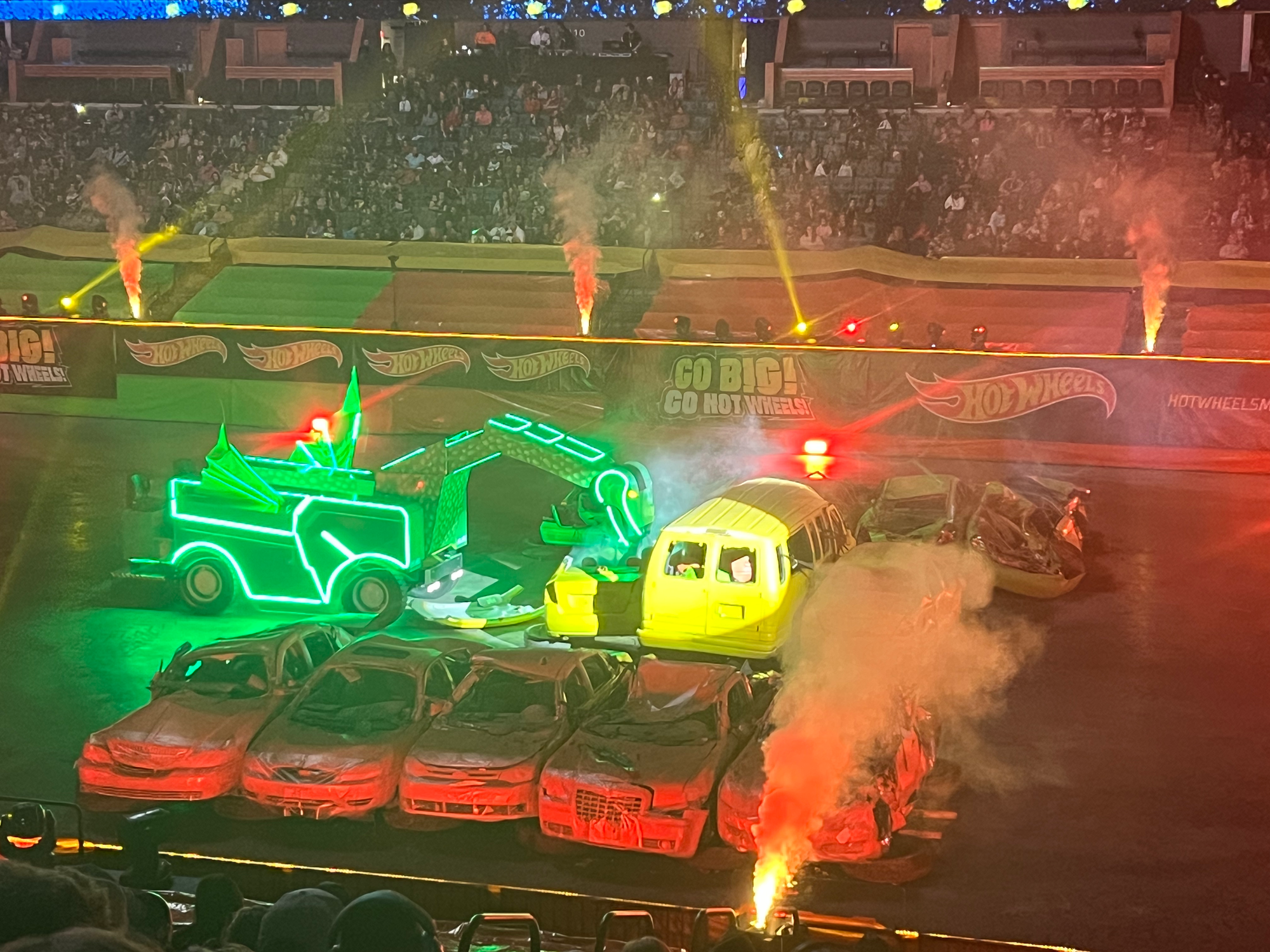 I lack the context and the youthfulness to presume that the touring company of Hot Wheels Monster Trucks Live Glow-n-Fire is aiming for me, but I think elements of it were universally enjoyable. At its best, it was like being inside a toy commercial, replete with excited children clutching actual Hot Wheels and a far-too-boisterous-for-my-taste voiceover from the emcee. Toy commercials are 30 seconds long, which is the right length to sustain that frenetic energy. This rally was two hours long, which is not. Many beleaguered parents toted their half-asleep children out well before it ended.