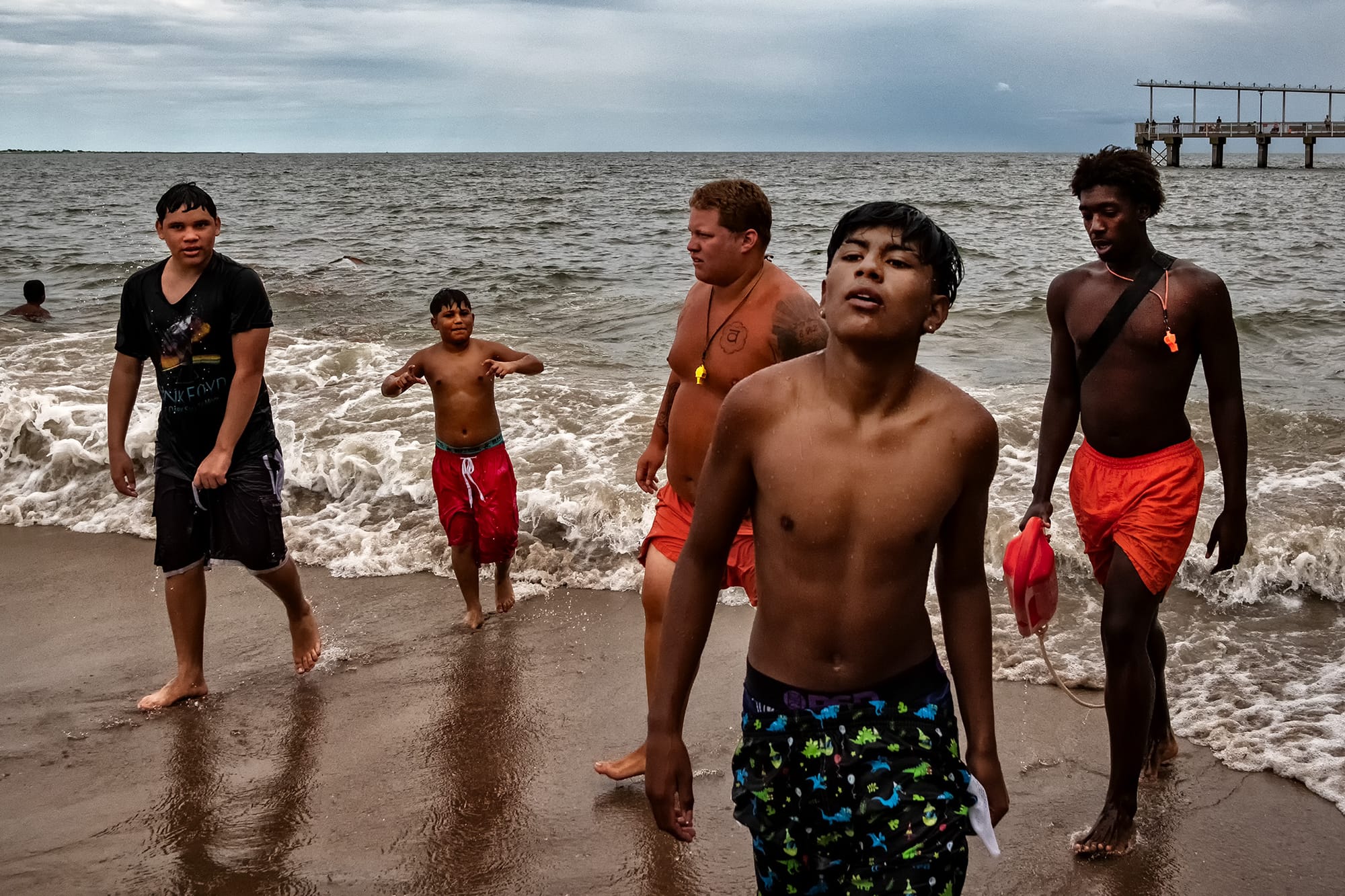 The photographs from the beach perhaps best show the spark Frucht is after. In Untitled, July 2025, we might look first at the faces, of people in transition, from water to air and land, coolness to heat. Are they talking to one another? Are they in their own worlds? The image doesn't let us decide. But it takes in more than the people, too. The wave behind them, for example, is frozen into a complex, compelling shape, all curls and textures, wafts of water and streaks of foam. We almost never get to see it this way. Frucht's snapshot gives us the chance.