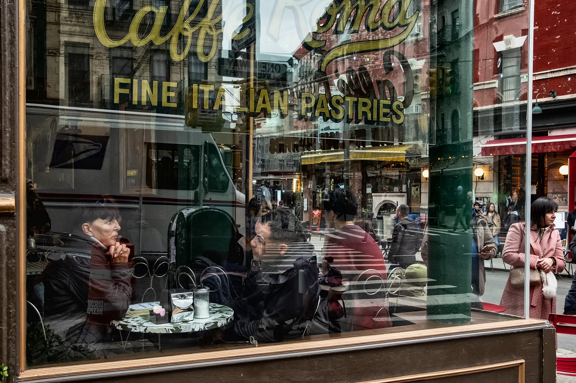 Finally, Frucht states that "recently a third path has emerged, in which I try to capture fast moments with slow processes, like an excursion into an imaginary universe that crosses reality sat an angle." The window shot of Caffe Roma (in which your correspondent has dawdled away many, many hours with a cappuccino and a cannoli) gives a sense of what Frucht means. The people in the picture — both the folks passing by in the street and the customers idling at their tables in the window — will never be there again in that combination. But the window itself has been there for a long time, reflecting the crosswalk and the buildings. The sun has cast the shadows of the painted letters into the cafe for years. Each moment on that corner may be unique, but the picture reminds us that there is something almost eternal about it, too. Until the cafe closes, people will mill in front of it while others sit in the window, and the coffee and pastry will be just as warm and sweet.