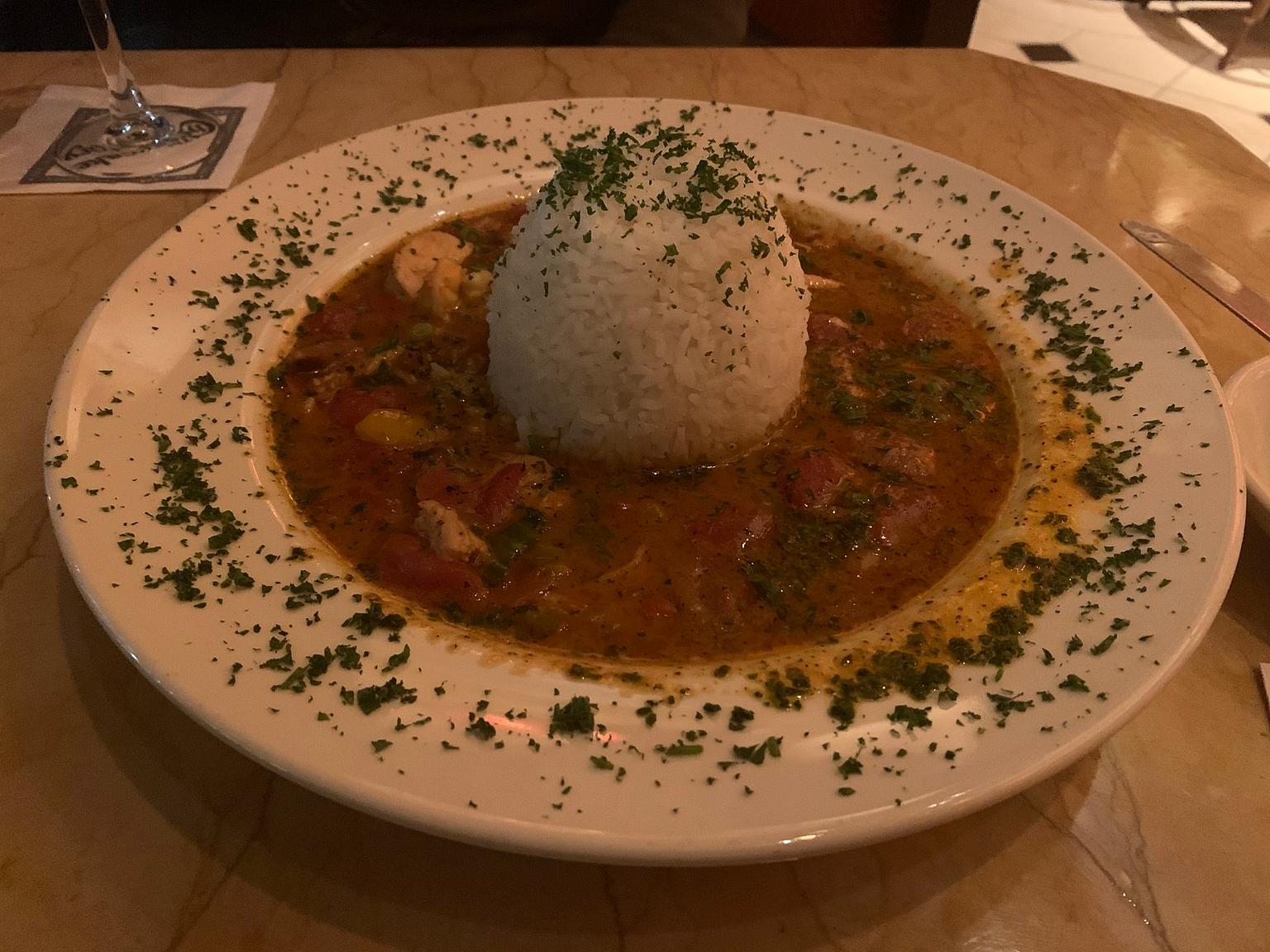 On the other hand, my friend chose the shrimp and chicken gumbo. It also had shrimp, chicken, tomatoes, peppers and onions, but it included andouille sausage and garlic simmered in a spicy Cajun style broth with cream and steamed white rice. I tasted her meal and found out where the spiciness I’d been promised had gone. The garlic enhanced the spice, giving it the kick that was missing from my jambalaya. My friend said she didn’t expect for her gumbo to be quite so soupy, but it was good nonetheless.
