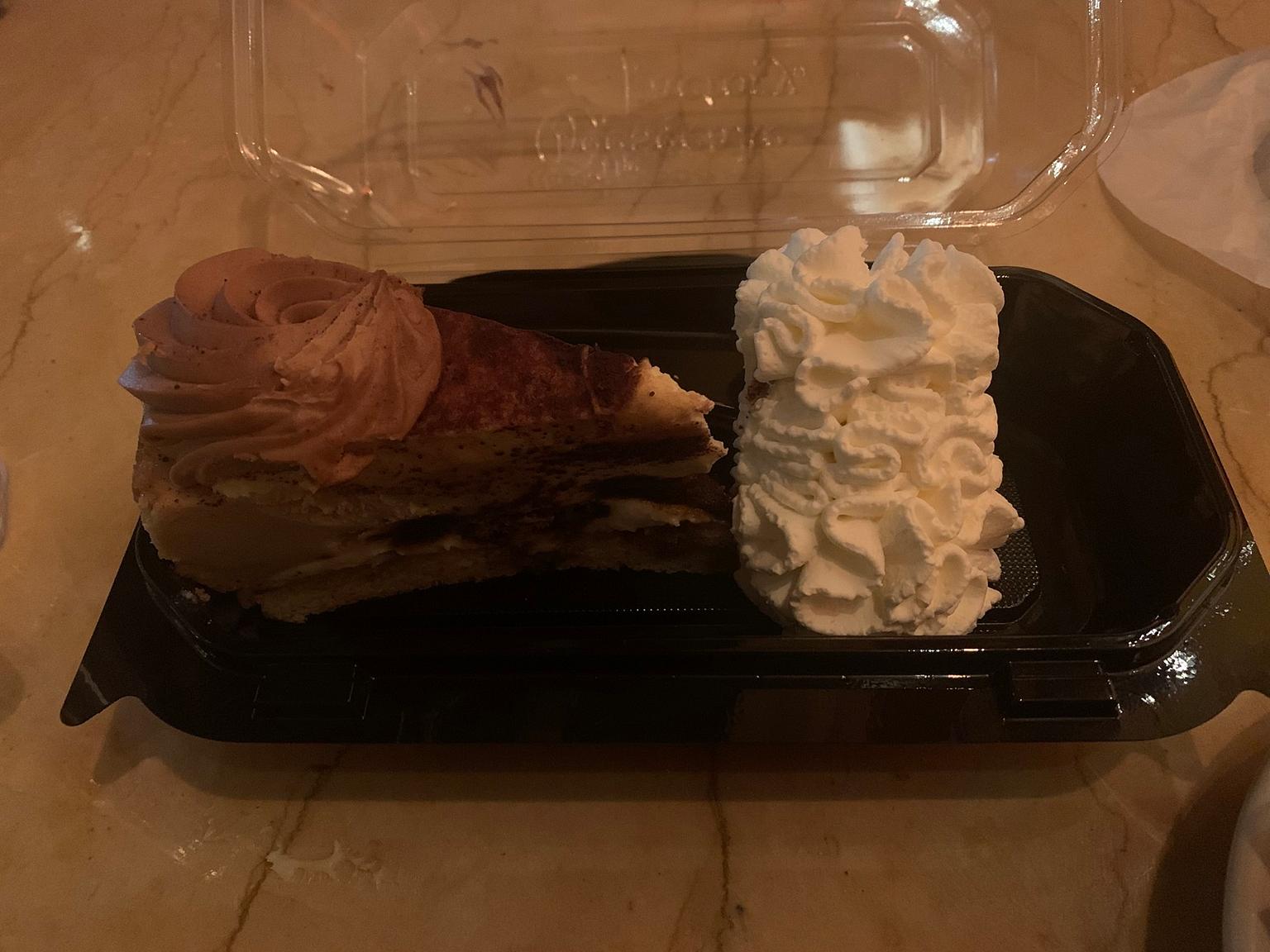 Finally, one can’t visit The Cheesecake Factory without trying The Cheesecake. We settled on the tiramisu cheesecake, which was literally tiramisu and cheesecake combined. It had a stronger coffee flavor to me than the espresso martini did, down to the bitter aftertaste that lingered on the back of my tongue. The whipped cream was light and fluffy, and I ate that while she ate the cheesecake. In her words, it was “perfect.”