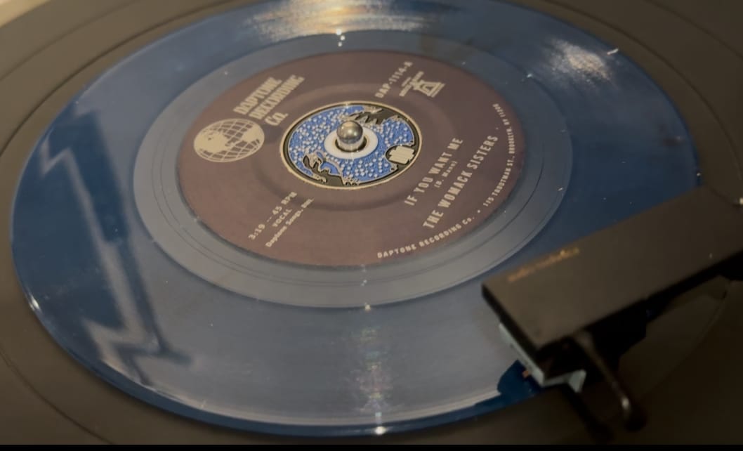 It’s a 45 (another rarity these days) of deep blue vinyl with the Womack Sisters’ “I Just Don’t Want You (To Say Goodbye)” as the A side.