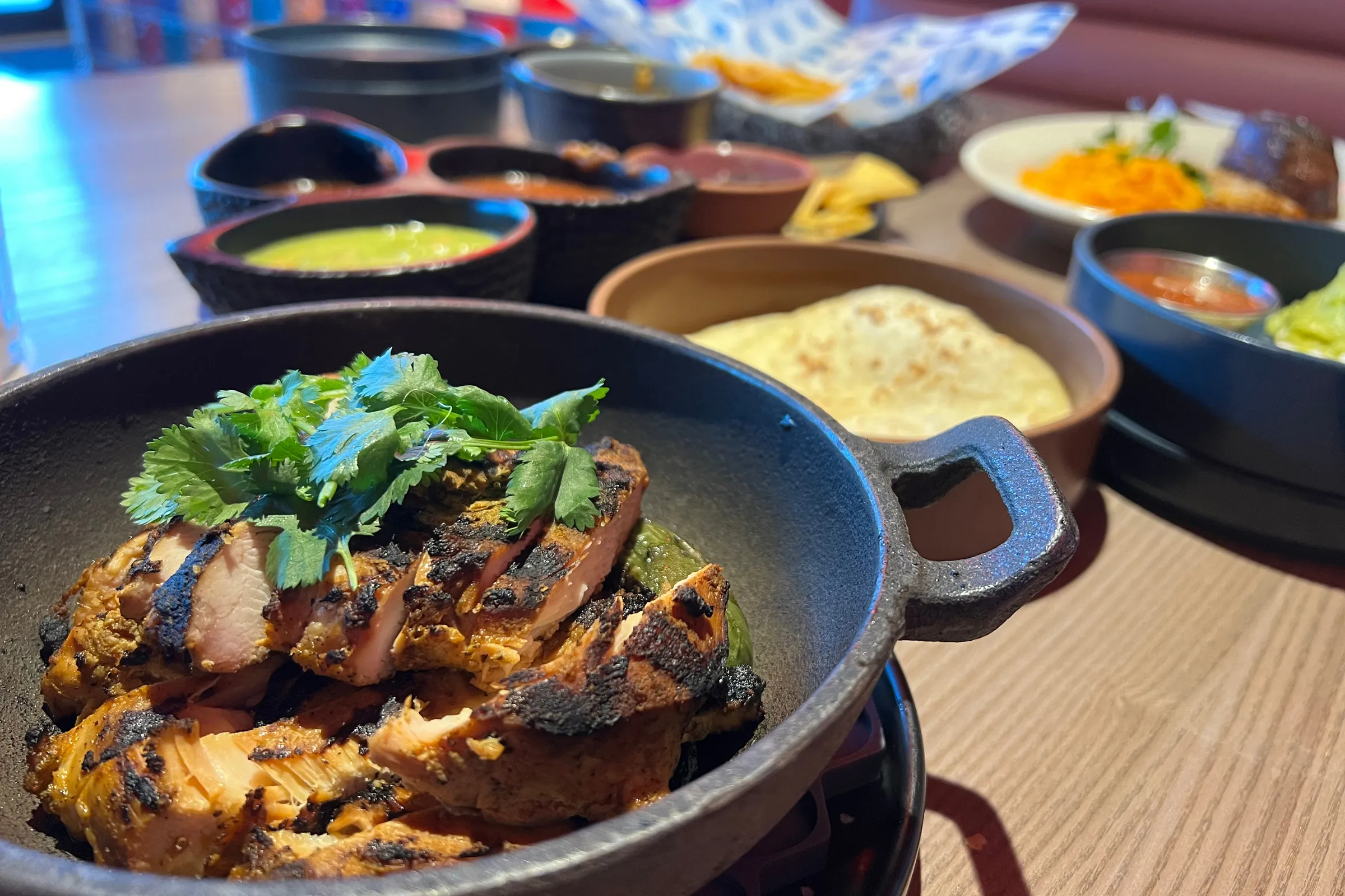Fun but focused, Noche Woodfire Grill & Agave Bar feels happening. Each side of the divided dining room is awash in red and blue jewel tones with cheeky neon signage. FLOUR POWER, reads one. ¡SALUD! reads another. The visual impact makes what the restaurant is trying to be immediately clear: vibrant, approachable but with a few signature twists. The menu, a medium-deep dive into the cuisine of Mexico, doubles down on that intent.
