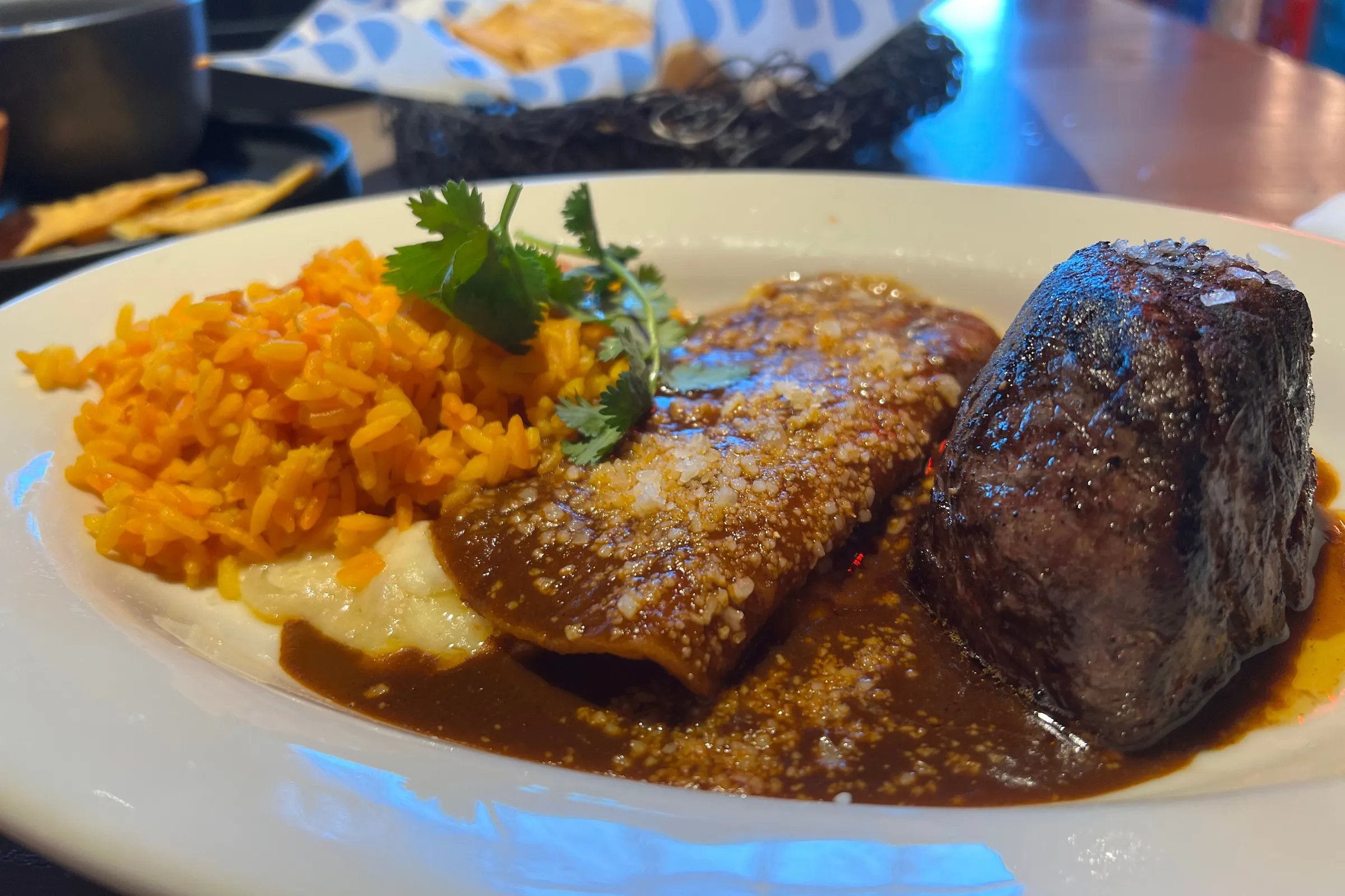 The chicken fajitas were a far more generous portion than the shrimp, and while the smoky flavor was great, they read just a tiny bit dry. Even with a marinade, I feel this is the cost of doing business with chicken breasts, and people who prefer white meat chicken would probably have no complaints. We also had the tampiqueña, here an end cut of a beef tenderloin served with golden rice and a single cheese enchilada. The steak was steak, and the rice was as good as last time. The cheese enchilada is where the plate veers off road.