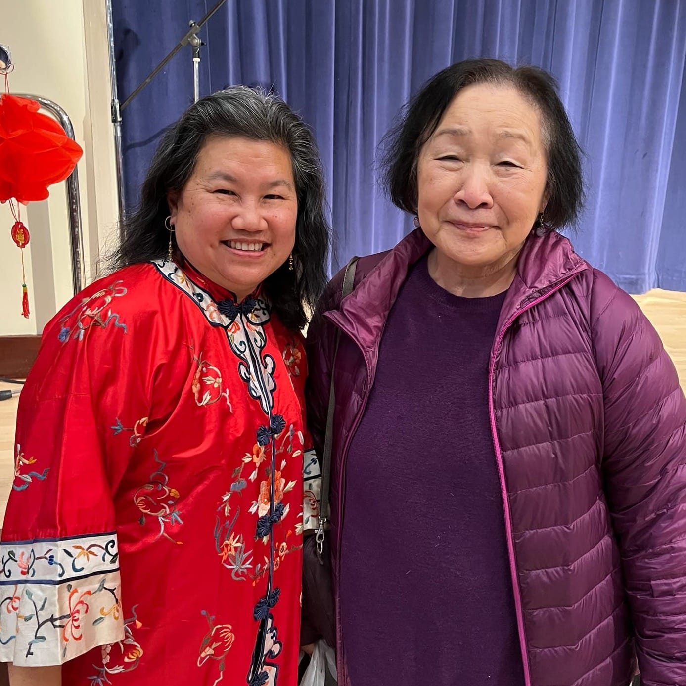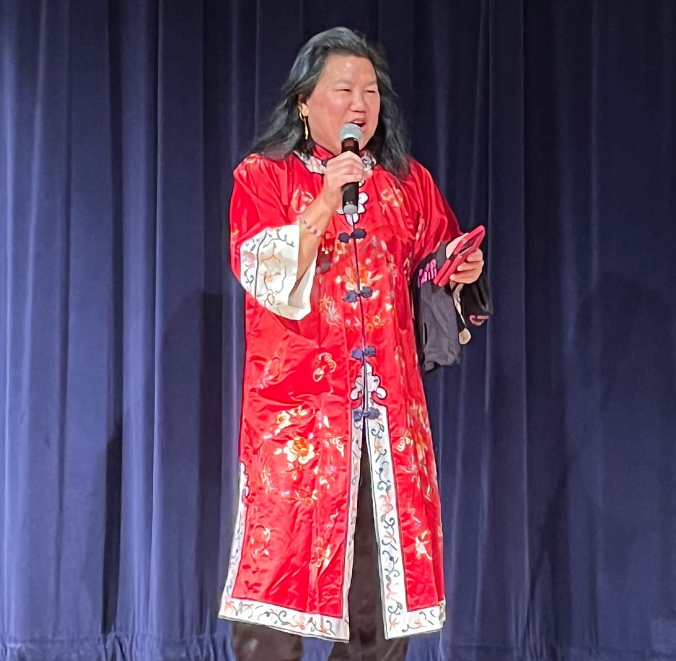 I hustled through the day’s wetness into the expansive Pacific Renaissance Plaza and up dangerously slippery stairs to the second floor venue. At first it didn’t seem like much: traditional red Asian new year decorations placed on the walls and on tables in the lobby, paper Chinese lanterns, etc. But when I entered the large auditorium nearly every seat was taken, mostly by families with young children who screeched and ran up and down the aisles. Somehow I was able to get a seat near the back.