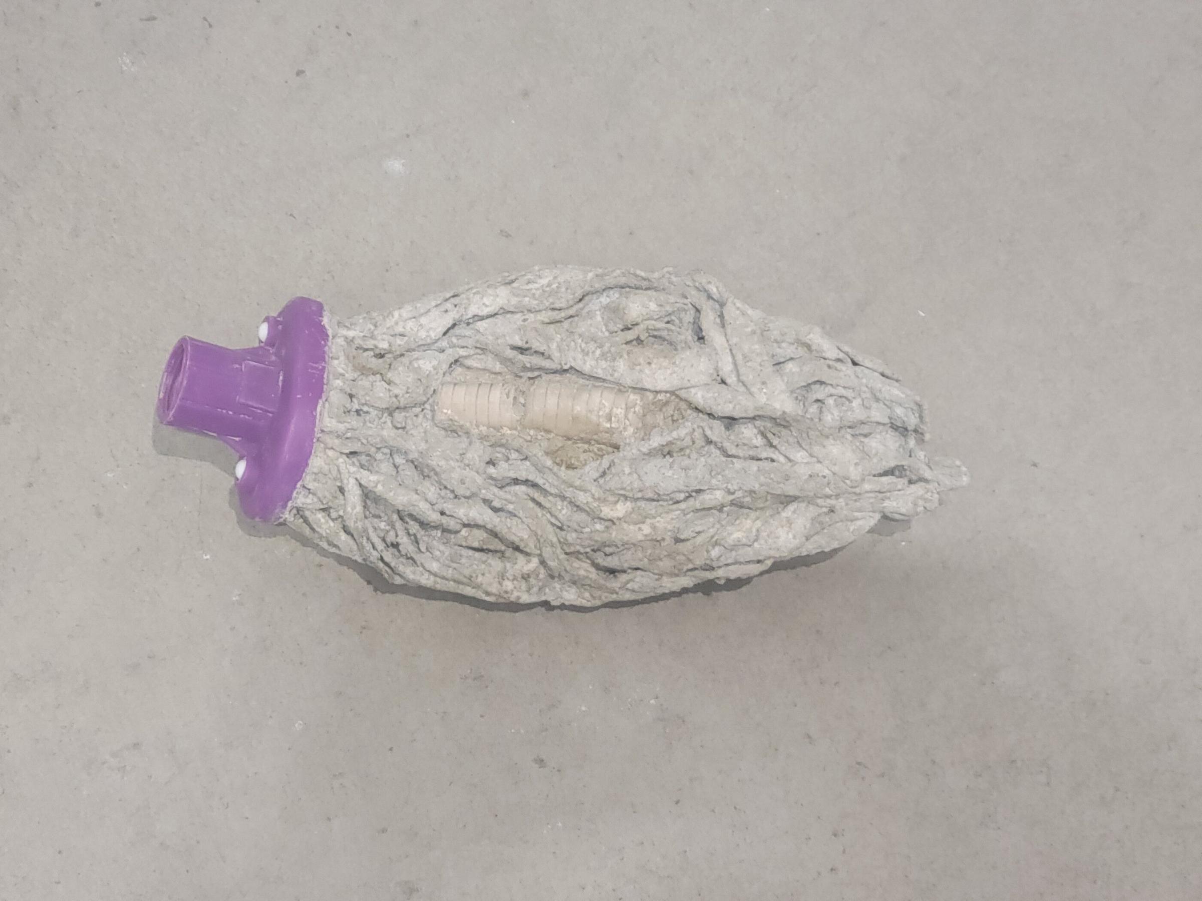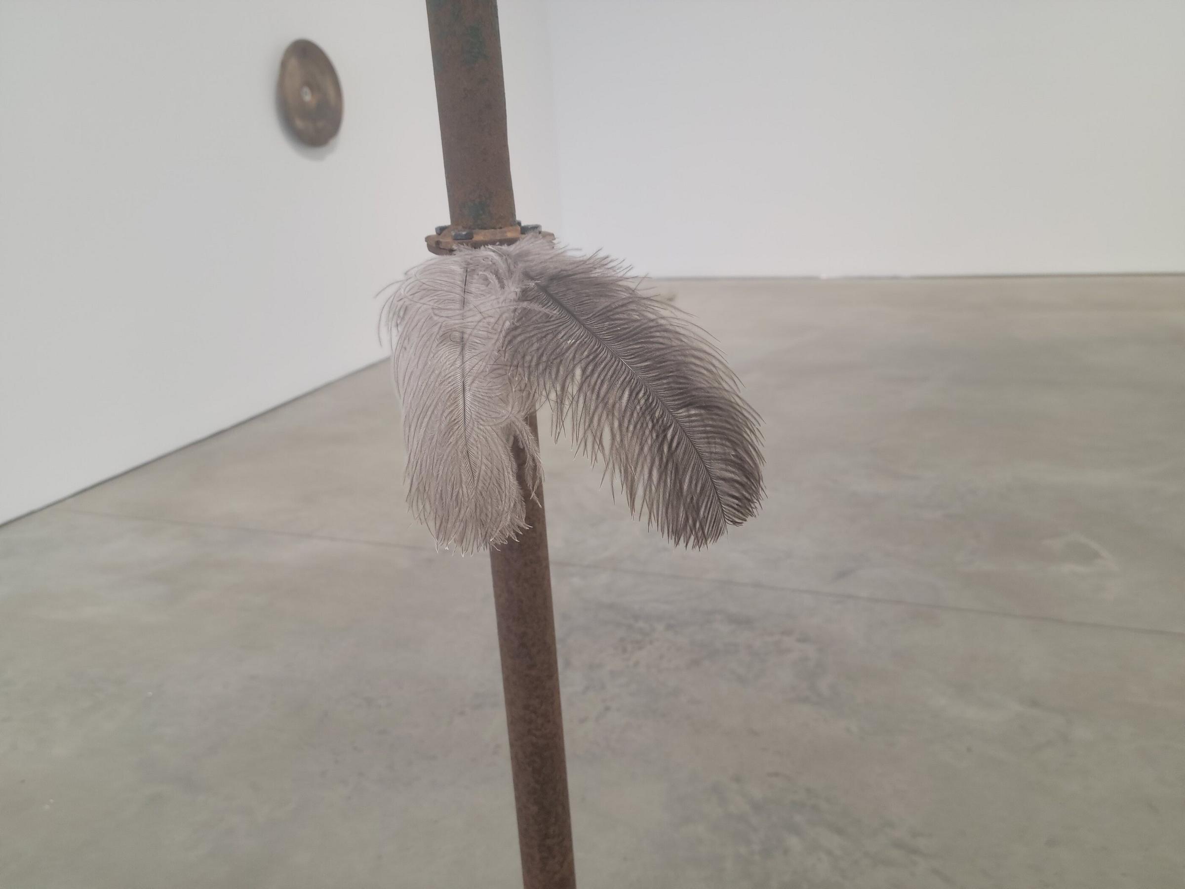Unlike Duchamp’s readymades, Crynoid is far from a prefabricated, mass-produced, mop tossed on the floor. Cast in concrete, the artwork resembles a petrified rock. A mophead grasps within its stone-like, Medusa locks, a fossilized crinoid from Sweden, the country where the Berlin-based artist was born. Crinoids date back to the Paleozoic Era, predating dinosaurs by 300 million years, according to the British Geological Survey. The plant-like marine animals have feathery arms, a subtle wink to Canell’s feather duster piece, titled Hold. Looking more closely at Crynoid, an observer can see the spine-like stem of the crinoid encrusted in the tangle of mop strands.