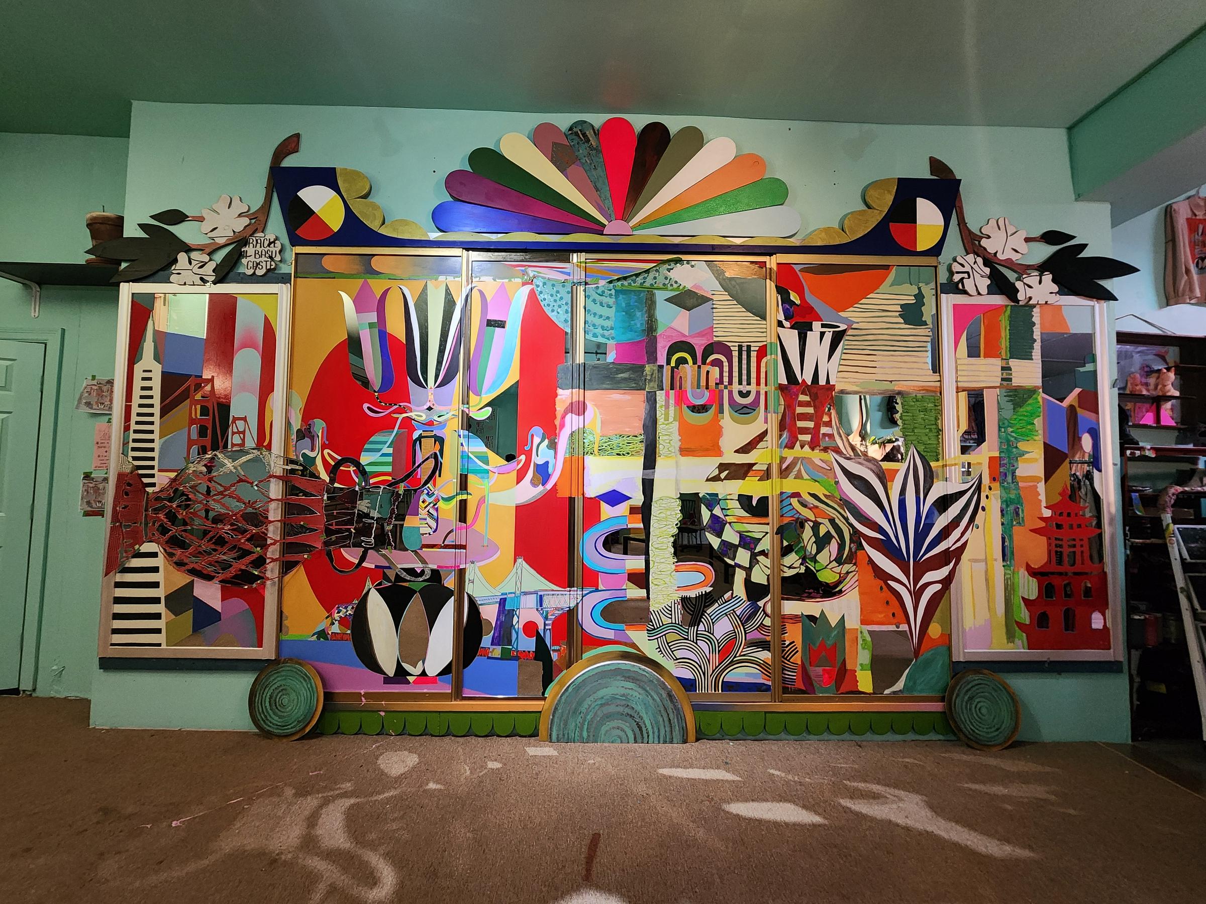 While the scale felt outsized inside the studio ‚I can imagine how beautiful and bright it will be once in public. A brightly-hued rainbow fan sits atop a sleigh, itself rested on sliding-door panels. Cutout leaves and branches frame its edges, with those forms repeated in the mural below. An Oakland oak tree branches from the base, its black and white lines streaked with color.