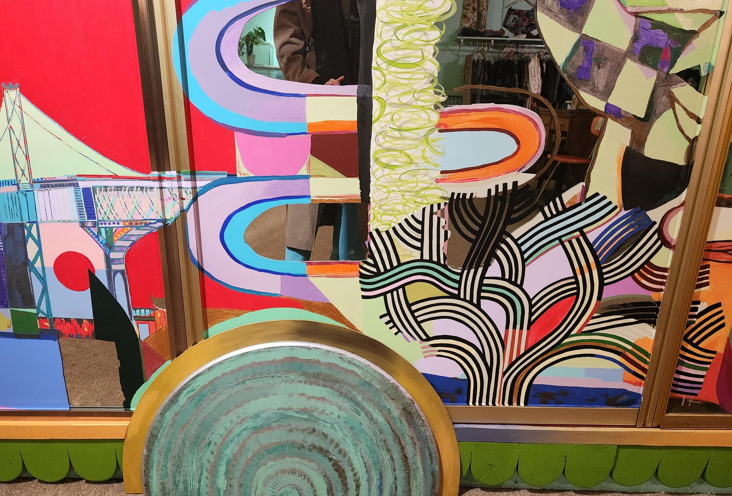 The mural is busy, no question there, but well planned and deeply intricate. A sideways urn spills onto the Bay Bridge, a pagoda emerges from the bottom right corner, and the Golden Gate Bridge and Transamerica building occupy the far left panel, a Cubist backdrop grounding them.