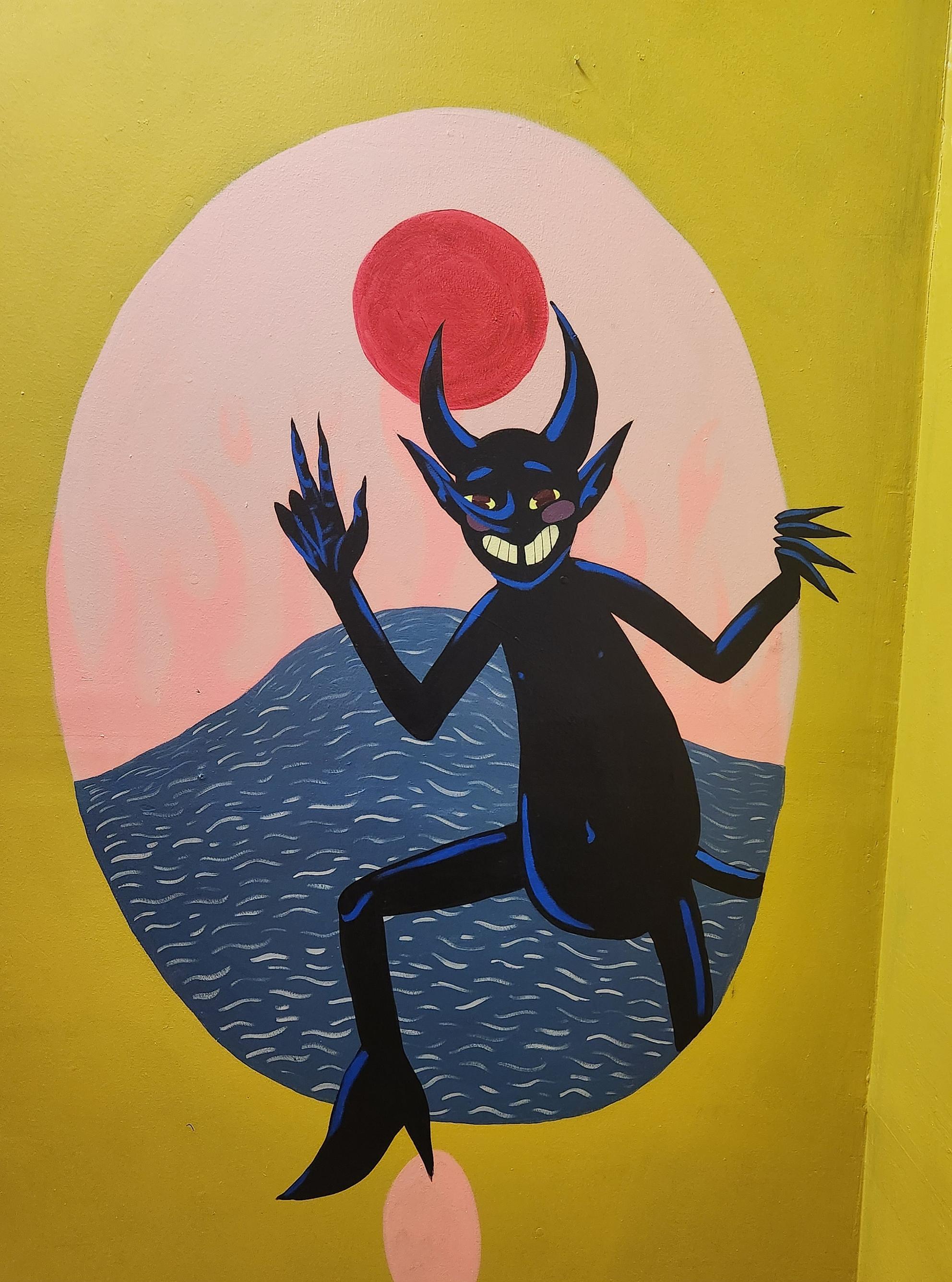 Beckoning into the small back room used as a tattoo parlor by Lil Daddy Poke, the dark creature enters the room as he exits (or enters, backwards?) his painted oval home. One pointy-toed (and heeled) foot daintily steps and four sharp-as-nails fingers clutch his false frame. Purple cheeks blush above a crooked and bashful grin, his limbs and round belly highlighted in blue.