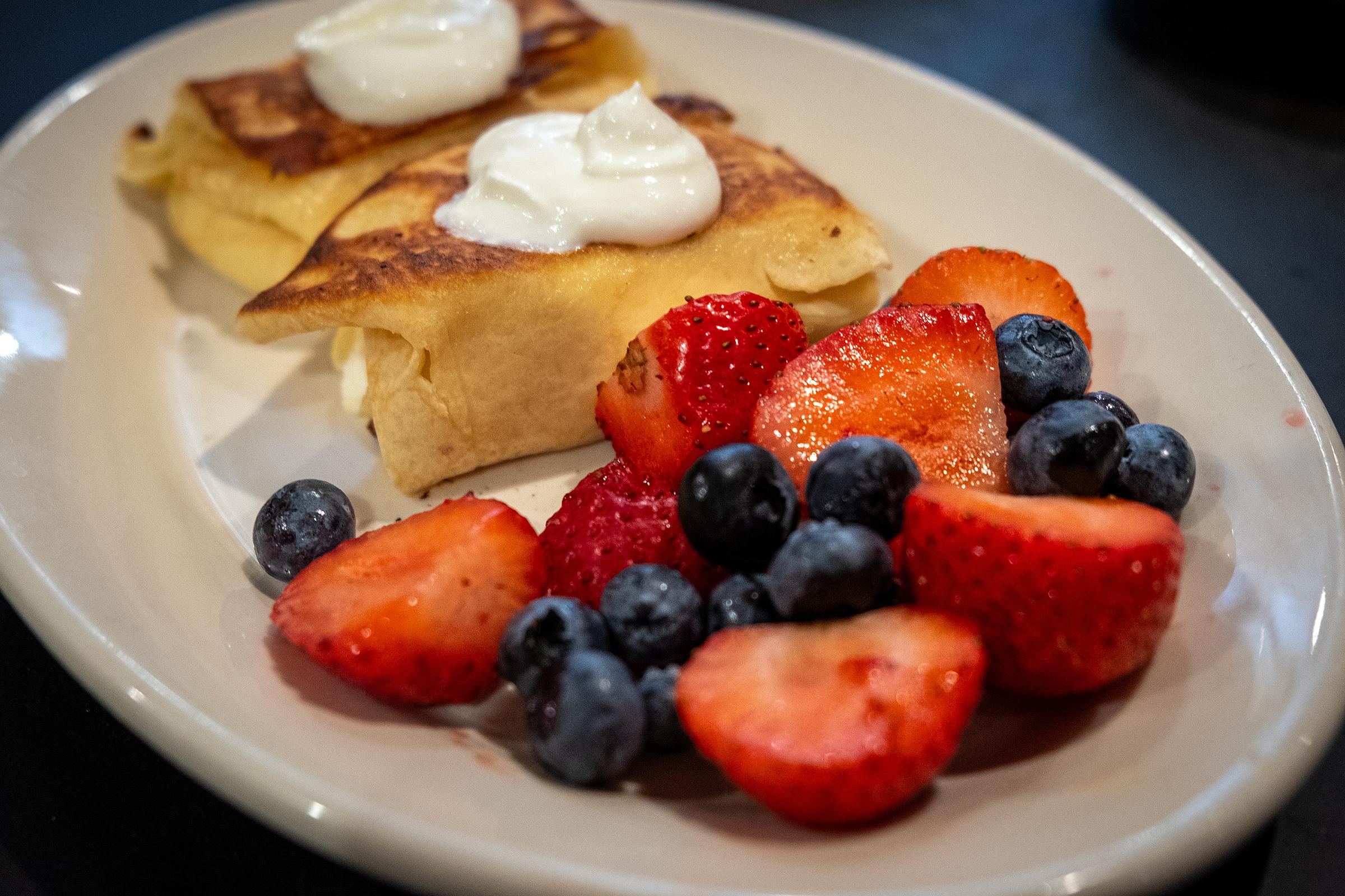 The cheese blintzes, which were warm and well-filled, came with a lovely mountain of fresh, room temperature berries. The naturally sweet, bright taste of the berries perfectly complemented the rich cheese filling, and also added necessary texture. It seems like a small detail, but we also really appreciated that the berries were served at room temperature rather than chilled, so they did not take away from the warmth. Eating these blintzes gave us both that idyllic “weekend morning breakfast” feeling, midday on a Tuesday. As a starter, blintzes come two to an order, which is perfect for an appetizer, but we definitely regret not ordering the full size serving ($12.95).