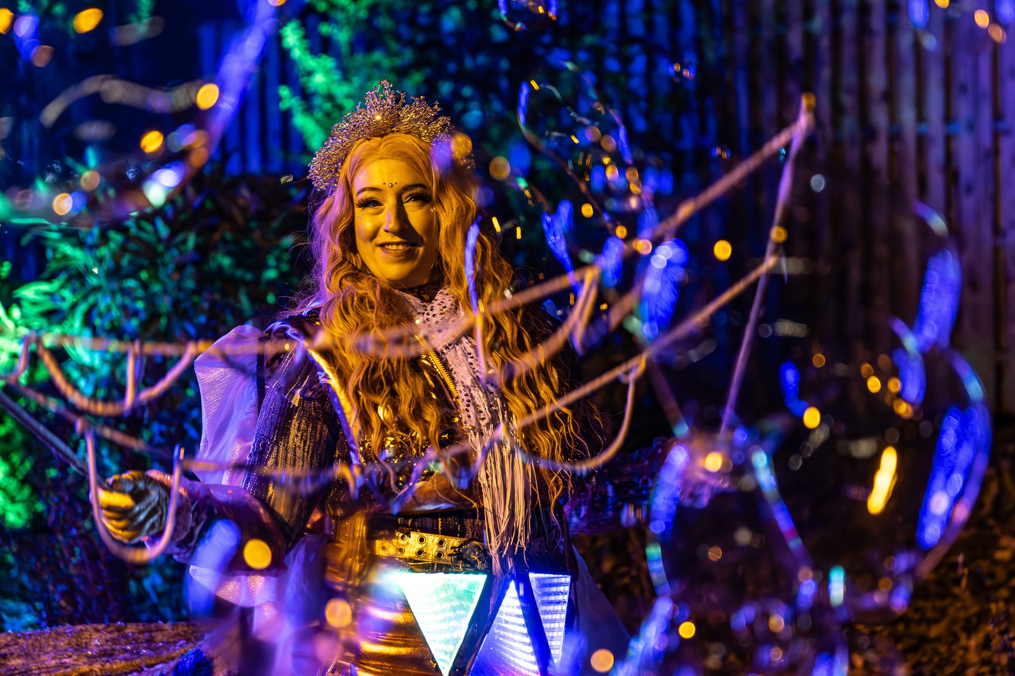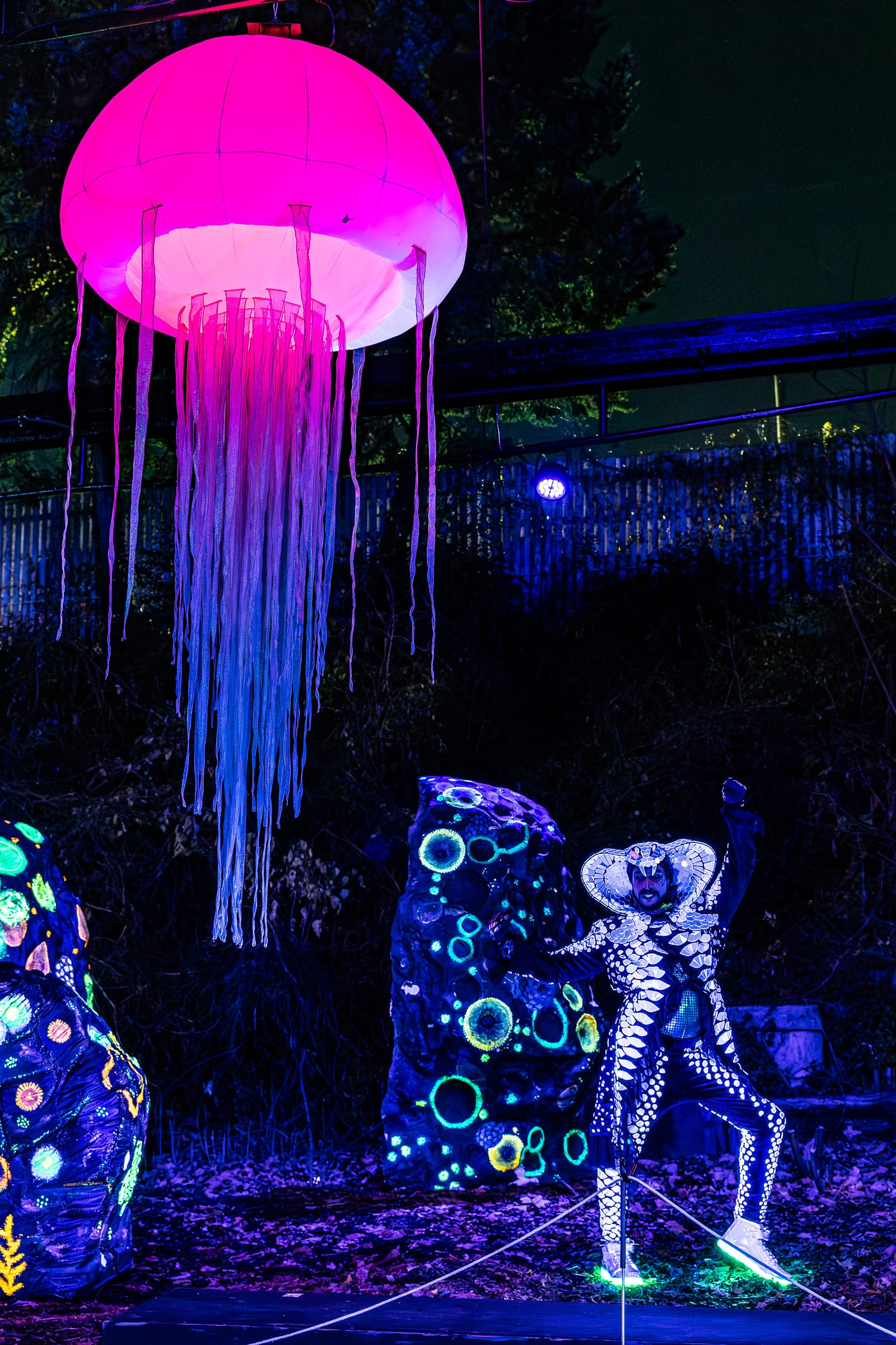 Next in the quest, we happened upon “The Leopard” and “The Tortoise” who each had a game for us to compete in: an egg on spoon race from the tortoise and a pose off with the leopard. Next up we found “The Puca” (a shapeshifting spirit from Celtic folklore) playing “Stairway to Heaven” on his fiddle in the fairy garden, a song title we had to name ourselves before collecting our card. But the garden itself was even more magical than this mythical creature; it was illuminated with stunning wonder, from blinking lights emulating fairies flying in the grasses to a sparkling light tunnel that took us to a the snoring troll that you could wake up if you had a “zoo key” to insert into the keyhole in his yard. Our journey came to an end in front of the hippo pool, where we met a humanoid “Orangutan” who taught us a jig and handed us our sixth and final card.