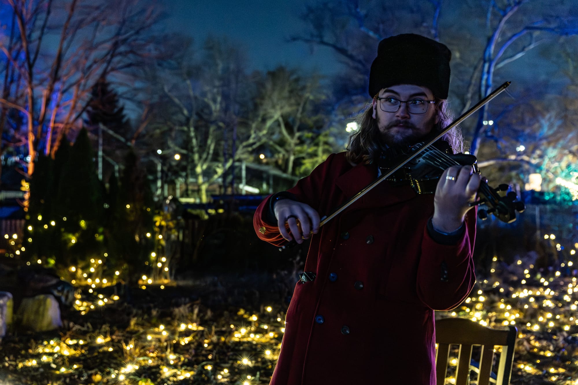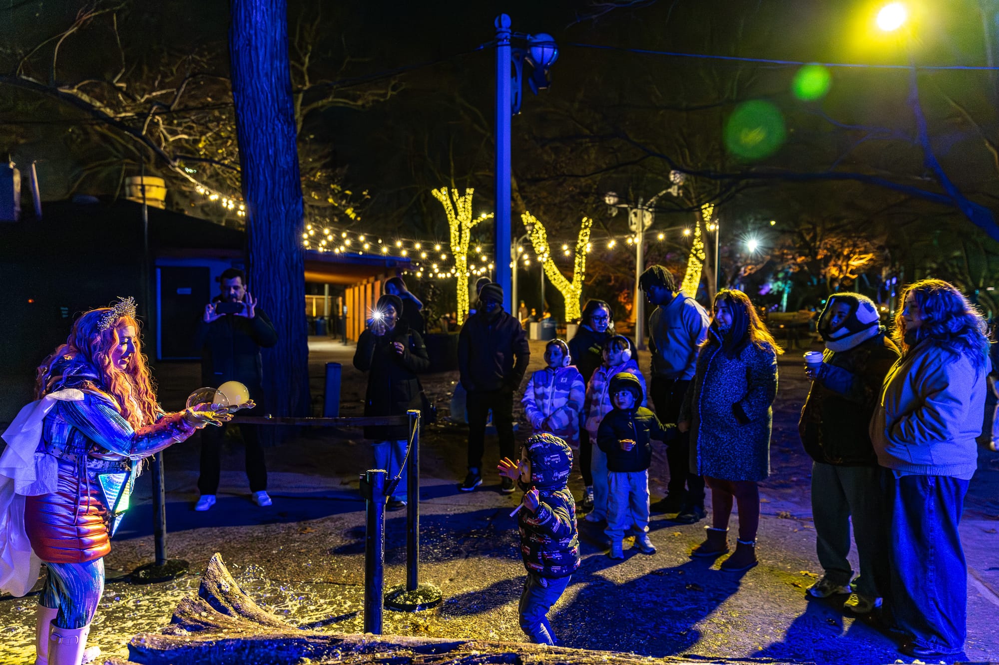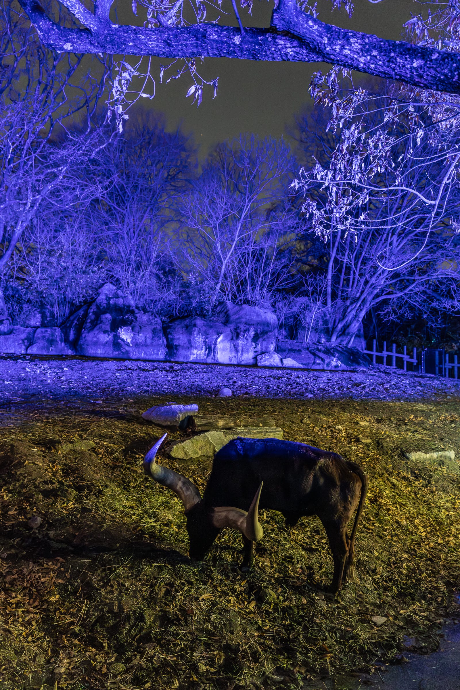 While most of the animal exhibits, except the Ankole cattle who happily grazed in their yard and cozied up in their barn, were closed off for the cold night, we had the lights of the exhibits to guide us through the zoo. Along the way we were greeted by various performers in their neon glow costumes reminiscent of what you’d expect at Burning Man, opportunities for snacks, drinks, fire pits to cook s’mores over, and, of course, our six side quests.