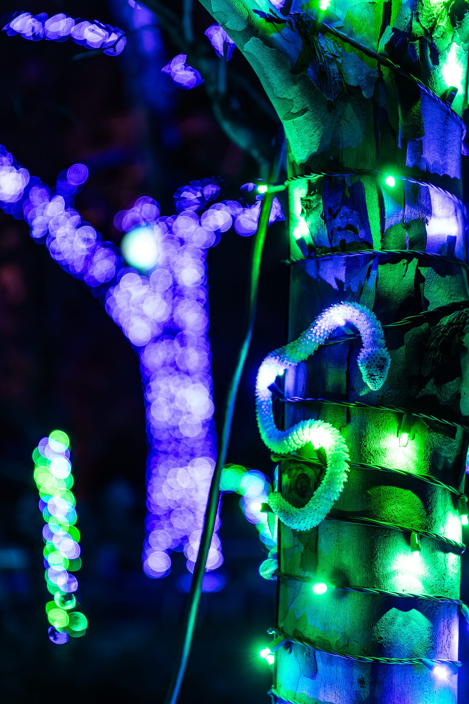 Starting at the newly reopened Treehouse next to the carousel, we met “The Raven,” who challenged us with riddles before handing us our card. Next we were transported by “The Snake” into “Ophis’ Hibernaculum,” where we had to find five of the seven snakes hidden in the outcove. Much to my delight, all of the snakes had back stories to go along with them. Like Tony; pictured hanging out on his tree in all his fluorescent glory, he reportedly runs a deli which sells cheese snakes… get it? Or Sarah, a boa constrictor who runs a lemonade stand, showing off her constricting skills by squeezing every last drop of juice out of lemons. Or the more serious snakes, like Quetzalcoatl, a real South American legend, who brought chocolate down from the mountains for humans to experience.